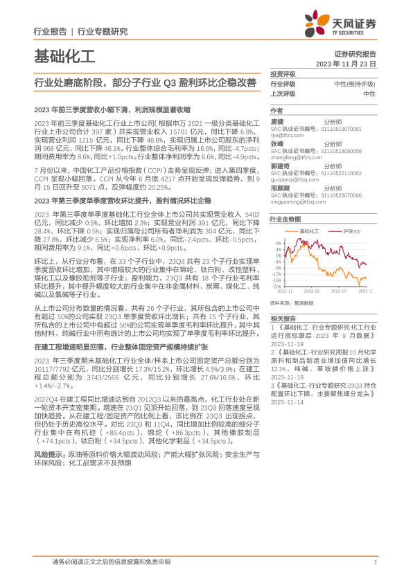 本报告基于公开数据对2023年前三季度基础化工行业进行了全面分析。数据显示,行业整体盈利能力下降,但部分子行业在第三季度表现出积极的复苏迹象。行业整体处于磨底阶段,资本开支增速回落,固定资产规模持续扩张。 投资者需关注原材料价格波动、产能扩张、安全环保以及下游需求等风险因素。 投资评级维持中性。 未来行业发展需要关注产业链整合、技术创新和可持续发展等方面。
