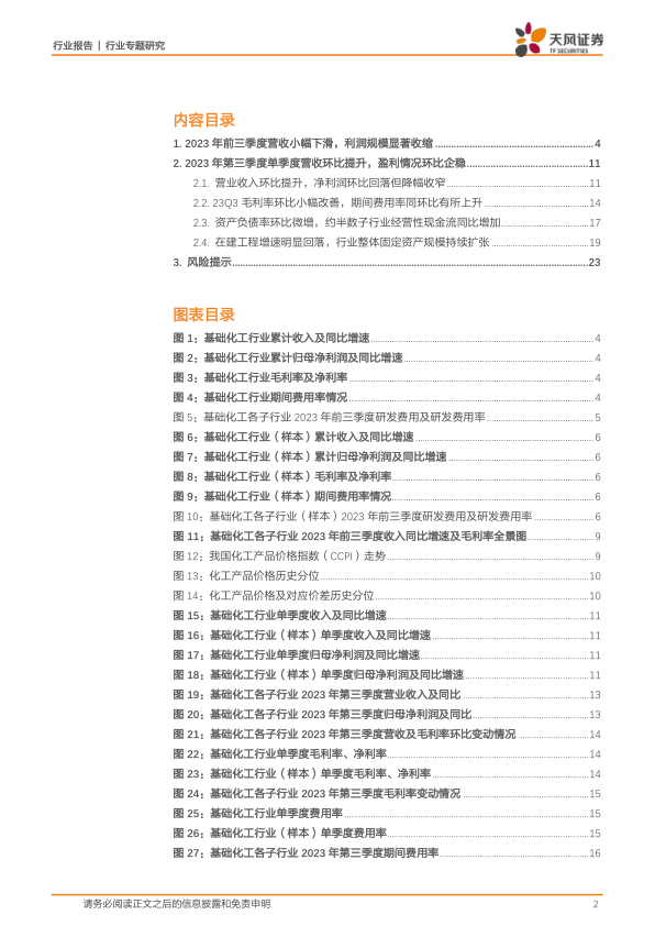 环比上,从行业分布看,在 33 个子行业中, 23Q3 共有 23 个子行业实现单季度营收环比增加,其中增幅较大的行业集中在锦纶、钛白粉、改性塑料、煤化工以及橡胶助剂等子行业; 盈利能力, 23Q3 共有 18 个子行业毛利率环比提升,其中提升幅度较大的行业集中在非金属材料、炭黑、煤化工、纯碱以及氯碱等子行业。