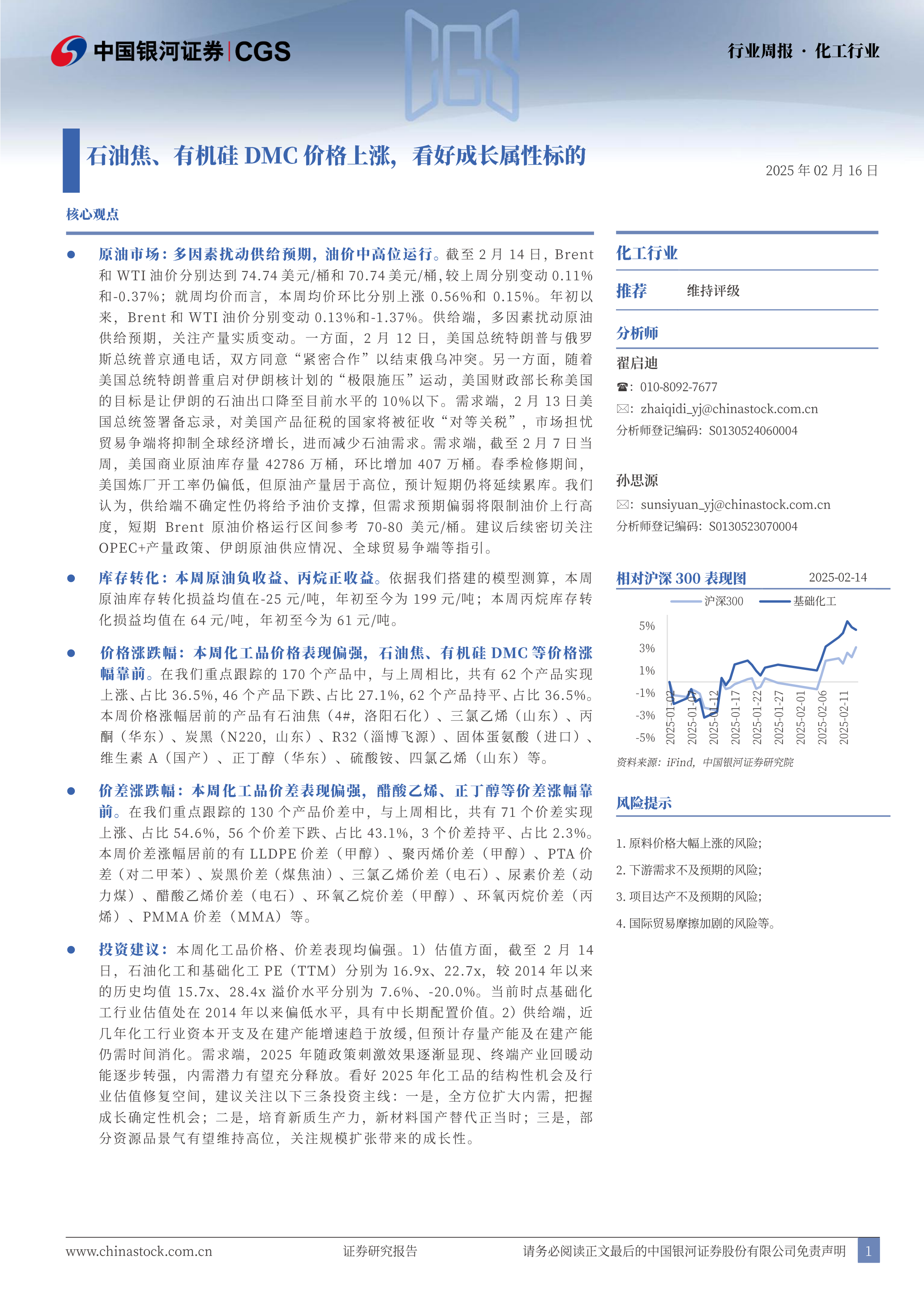 投资建议:本周化工品价格、价差表现均偏强。1)估值方面,截至2月14日,石油化工和基础化工PE(TTM)分别为16.9x、22.7x,较2014年以来的历史均值15.7x、28.4x溢价水平分别为7.6%、-20.0%。当前时点基础化工行业估值处在2014年以来偏低水平,具有中长期配置价值。2)供给端,近几年化工行业资本开支及在建产能增速趋于放缓,但预计存量产能及在建产能仍需时间消化。需求端,2025年随政策刺激效果逐渐显现、终端产业回暖动能逐步转强,内需潜力有望充分释放。看好2025年化工品的结构性机会及行业估值修复空间,建议关注以下三条投资主线:一是,全方位扩大内需,把握成长确定性机会;二是,培育新质生产力,新材料国产替代正当时;三是,部分资源品景气有望维持高位,关注规模扩张带来的成长性。