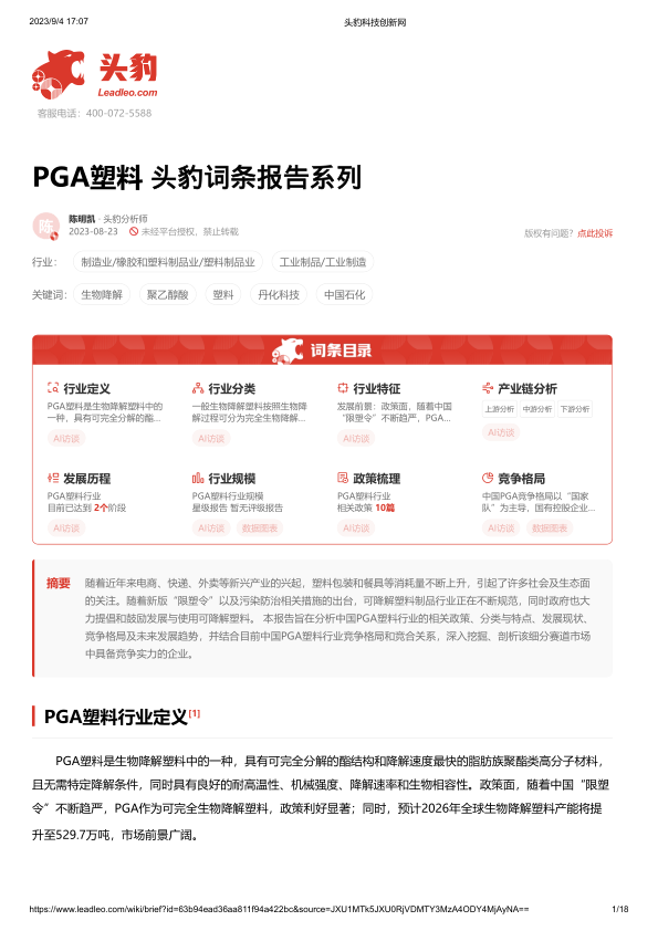 PGA塑料是一种完全生物降解的脂肪族聚酯类高分子材料,具有优异的生物相容性、耐高温性和机械强度,但同时也存在亲水性差、脆性大等缺点。中国PGA塑料行业发展前景良好,得益于国家“限塑令”政策的支持和全球生物降解塑料市场规模的快速增长。然而,高生产成本和技术瓶颈是制约行业发展的主要因素。