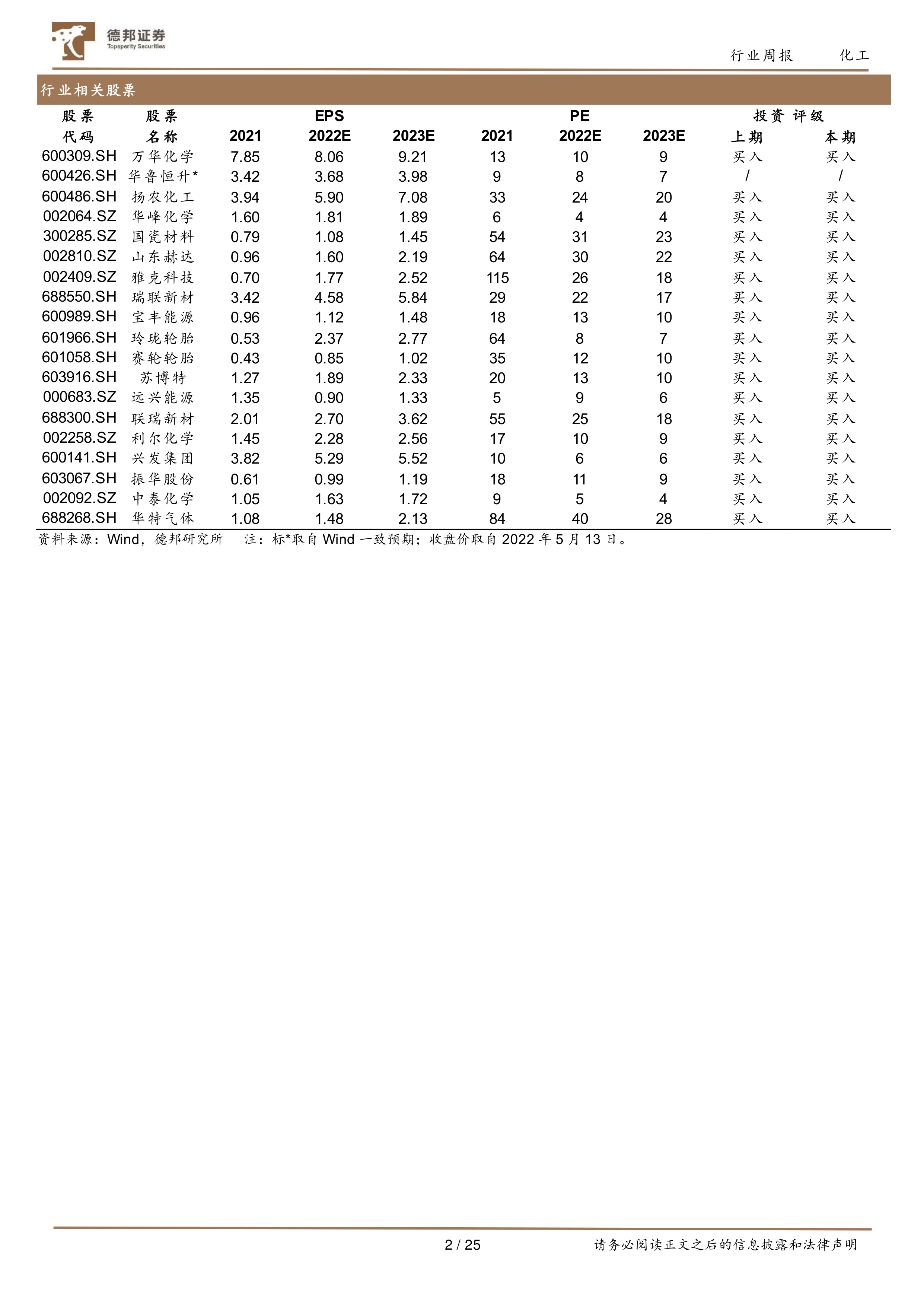 磷肥供需偏紧,成本支撑价格上行,海内外磷肥持续高价差,国内景气度有望保持上行,重点关注:云天化、川恒股份、兴发集团。苏博特持续推进产能扩张,大英基地率先投产,江门基地建设启动,全国战略布局逐步完善,公司持续推进新产品功能性材料,打造第二增长曲线,持续巩固行业龙头地位,重点关注:苏博特。稳增长背景下,国内纯碱需求旺盛,下游玻璃厂纯碱库存低位,光伏玻璃增长强劲,国内天然碱法龙头远兴能源,拟控股银根矿业,产能长期增长有保障,有望重塑供需格局,重点关注:远兴能源。 山东赫达子公司赫尔希持续释放植物胶囊产能,规模优势不断强化,有望问鼎亚洲第一品牌,同时凭借米特加的技术优势,加速食品级纤维素醚在人造肉领域的商业化落地,有望成为公司第二增长点, 重点关注:山东赫达。 国内化工各细分领域龙头历经多年的竞争与扩张,成本优势打造盈利护城河,全球市占率不断提高,目前估值扔处于低位, 重点关注:万华化学、华鲁恒升、扬农化工、华峰化学。百年轮胎,万亿市场,新冠疫情加速行业格局洗牌,国内轮胎龙头多方位持续开拓市场,市占率持续提升,有望保持高速增长, 重点关注:玲珑轮胎、赛轮轮胎、森麒麟。 在“双碳”背景下,国内持续完善全国煤炭交易市场,成本端推动新型煤化工发展,国内煤制烯烃领先企业宝丰能源,凭借成本优势保障盈利能力,重点关注:宝丰能源。草铵膦需求恢复,上游磷化工景气度高企,成本支撑草铵膦价格重回上行通道,利尔化学为国内龙头,成本及规模全球领先,业绩有望持续增长,重点关注:利尔化学。