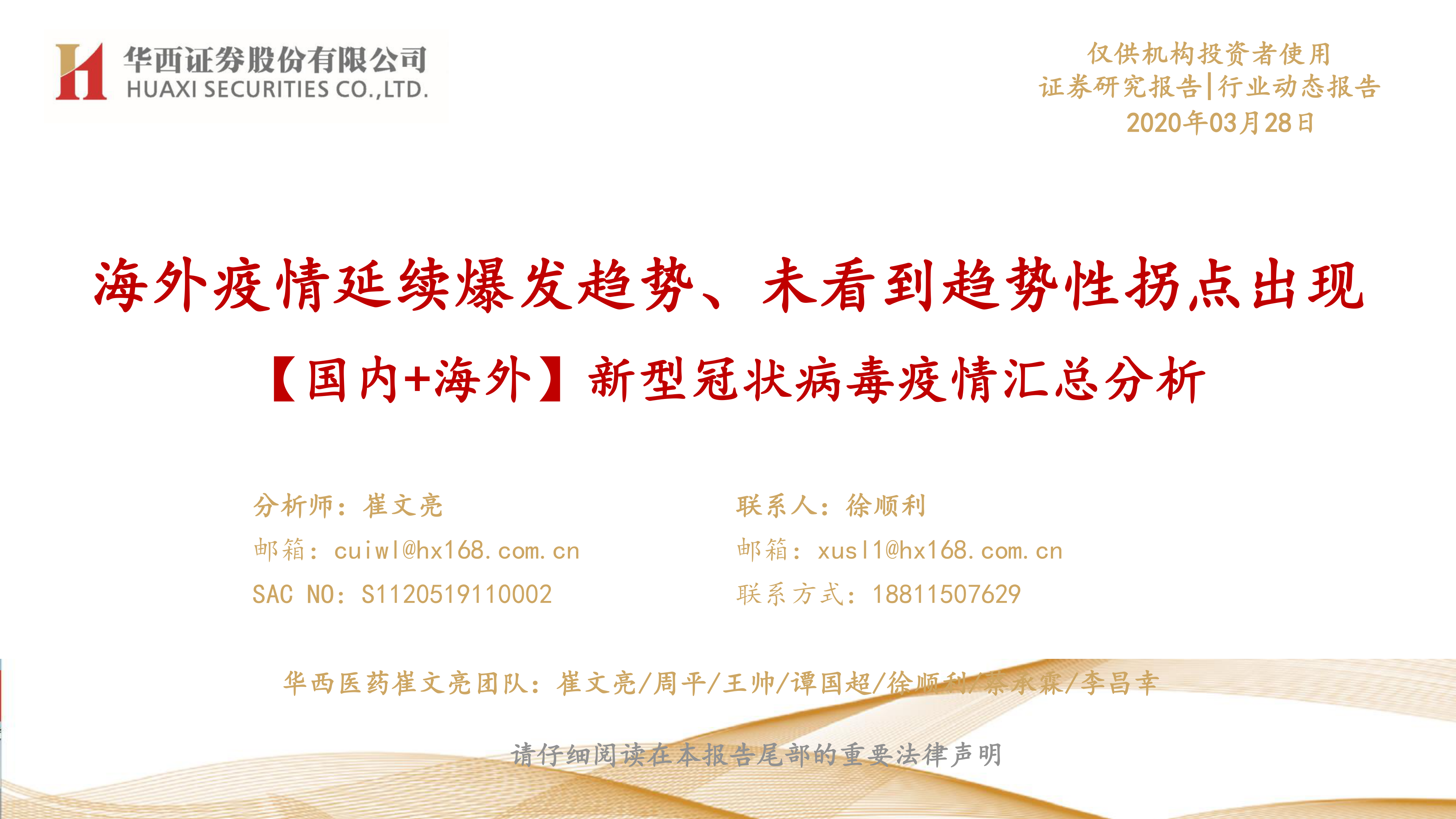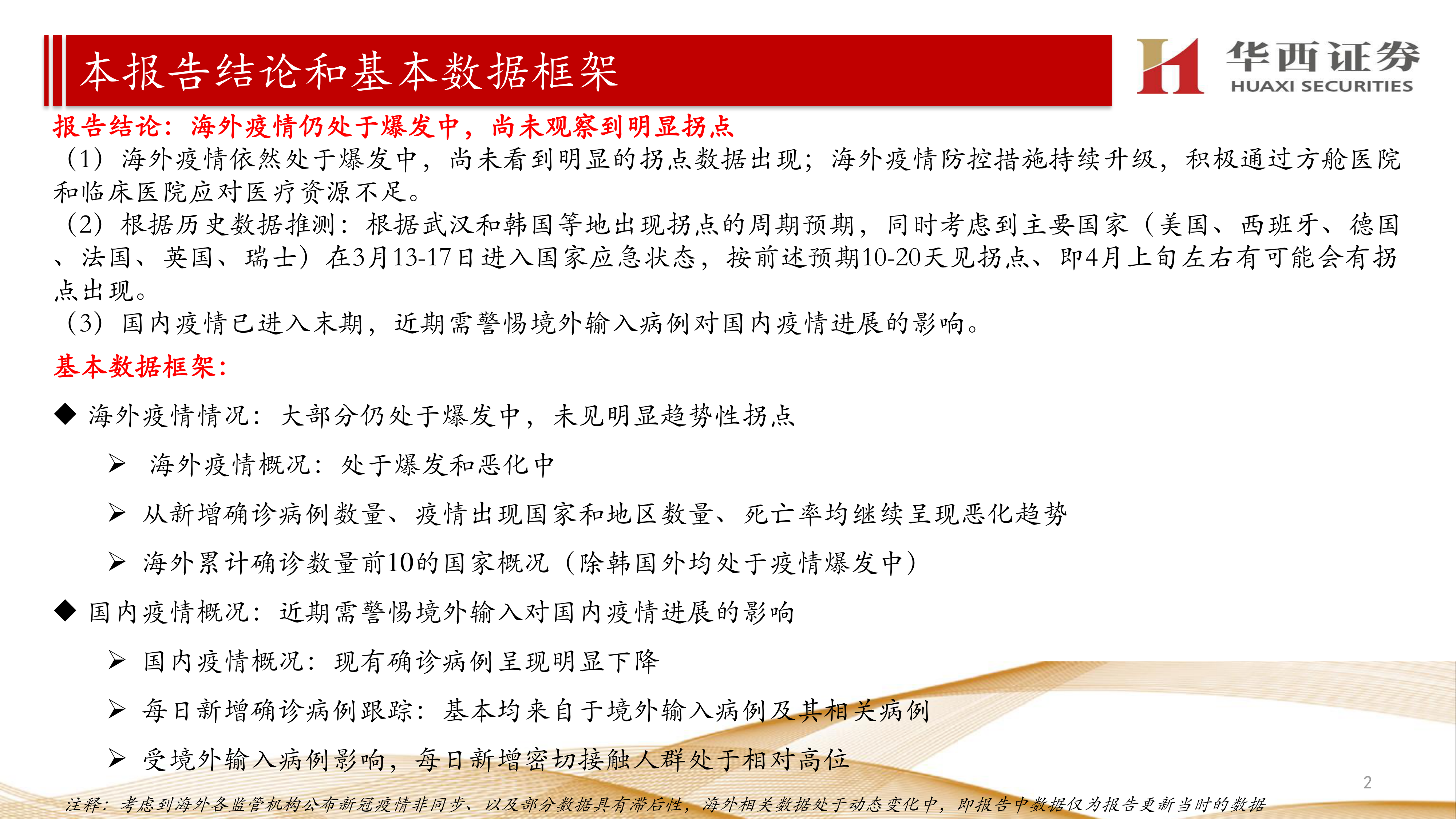本报告的核心观点是:2020年3月底,全球新冠疫情持续恶化,尚未出现明显的拐点;而中国国内疫情已进入末期,但需警惕境外输入病例的影响。报告通过对海外疫情(尤其重点国家)和国内疫情的统计数据分析,预测了疫情可能的拐点时间,并对各国防控措施进行了总结。