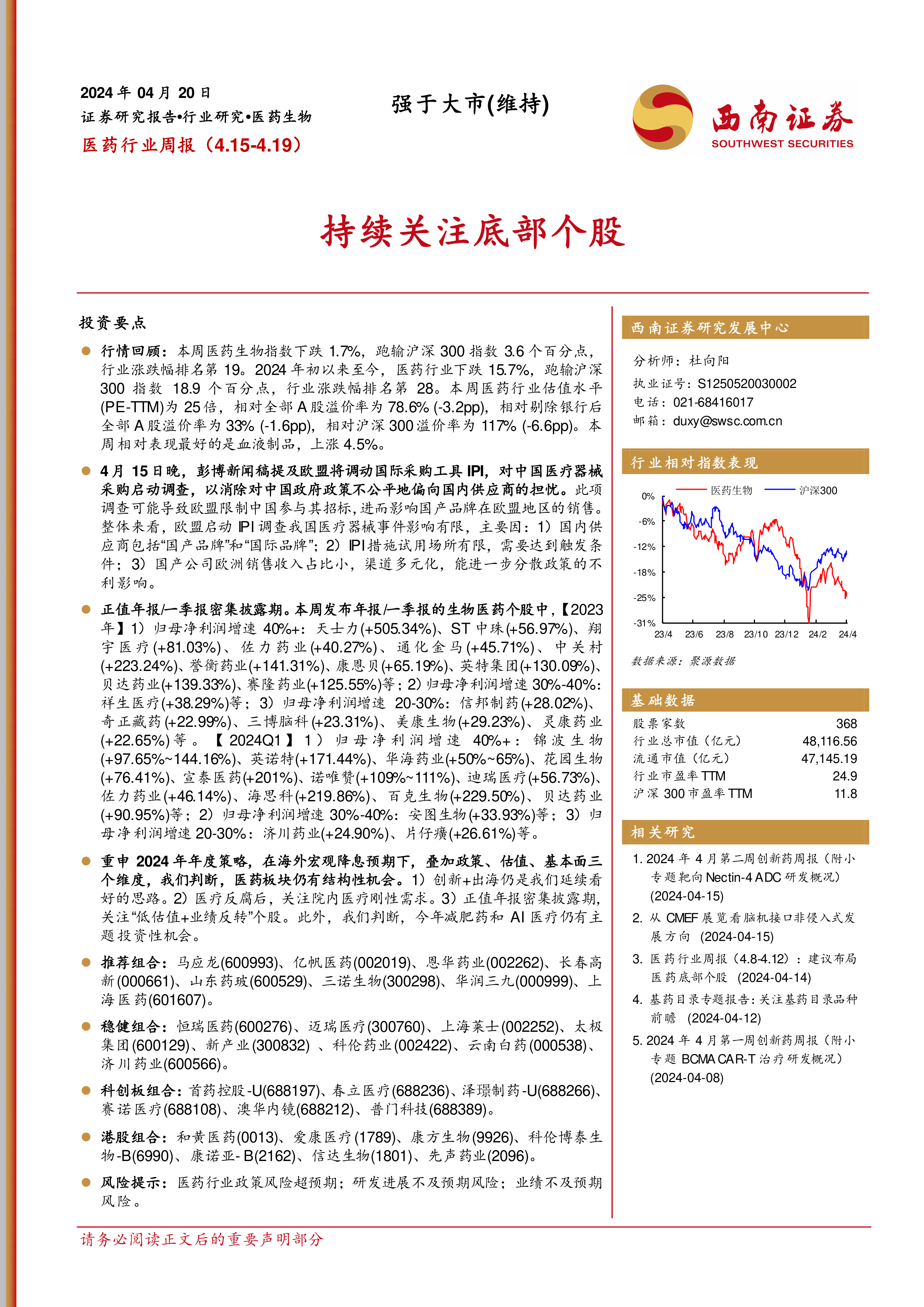 本报告对2024年4月15日至4月19日一周的医药行业市场表现进行了全面分析,涵盖了市场行情回顾、估值水平分析、资金流向分析、公司业绩表现、政策新闻解读以及投资策略建议等多个方面。报告数据翔实,分析客观,为投资者提供了有价值的参考信息。 尽管短期市场表现波动,但西南证券维持对医药板块结构性机会的积极判断,并建议投资者关注报告中提到的投资方向和重点个股。 需要注意的是,投资存在风险,投资者应谨慎决策。
