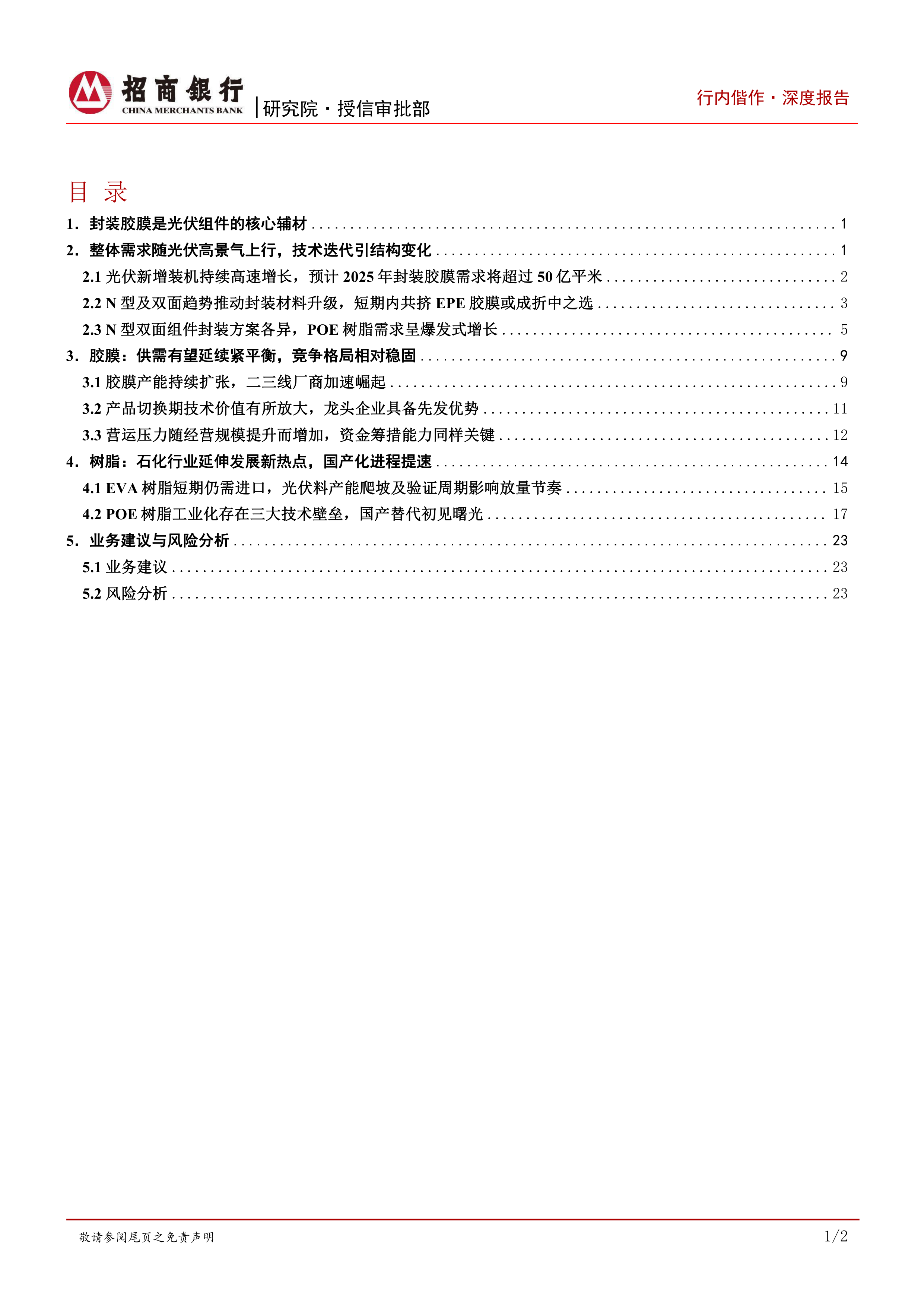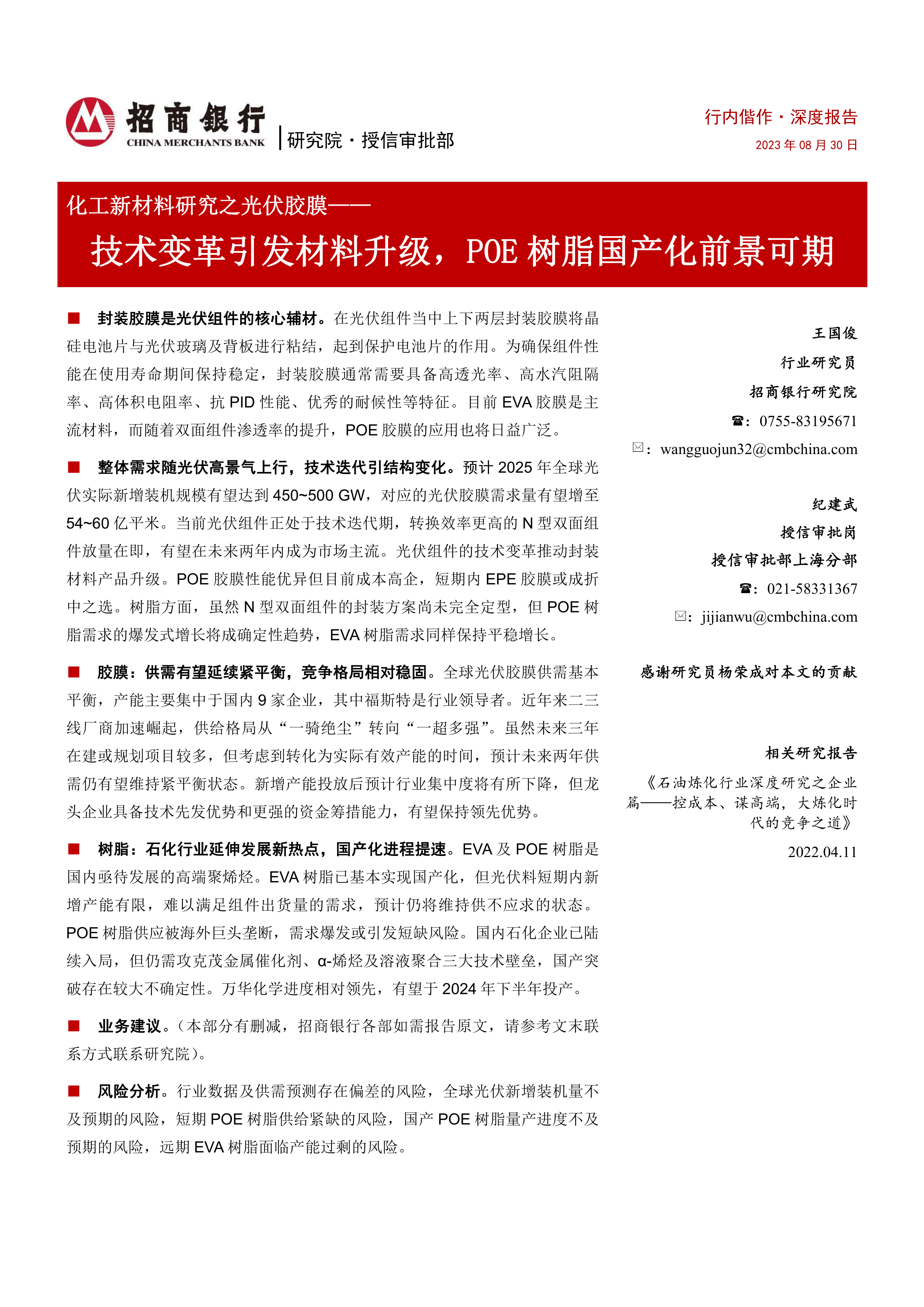 风险分析。行业数据及供需预测存在偏差的风险,全球光伏新增装机量不及预期的风险,短期POE树脂供给紧缺的风险,国产POE树脂量产进度不及预期的风险,远期EVA树脂面临产能过剩的风险。