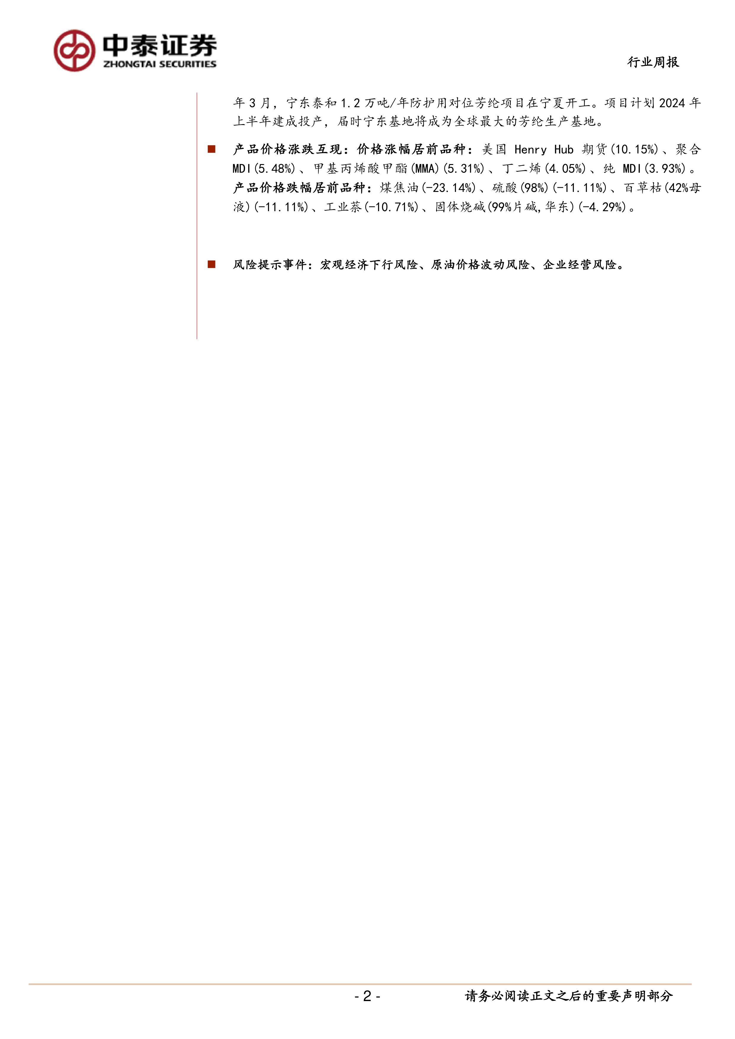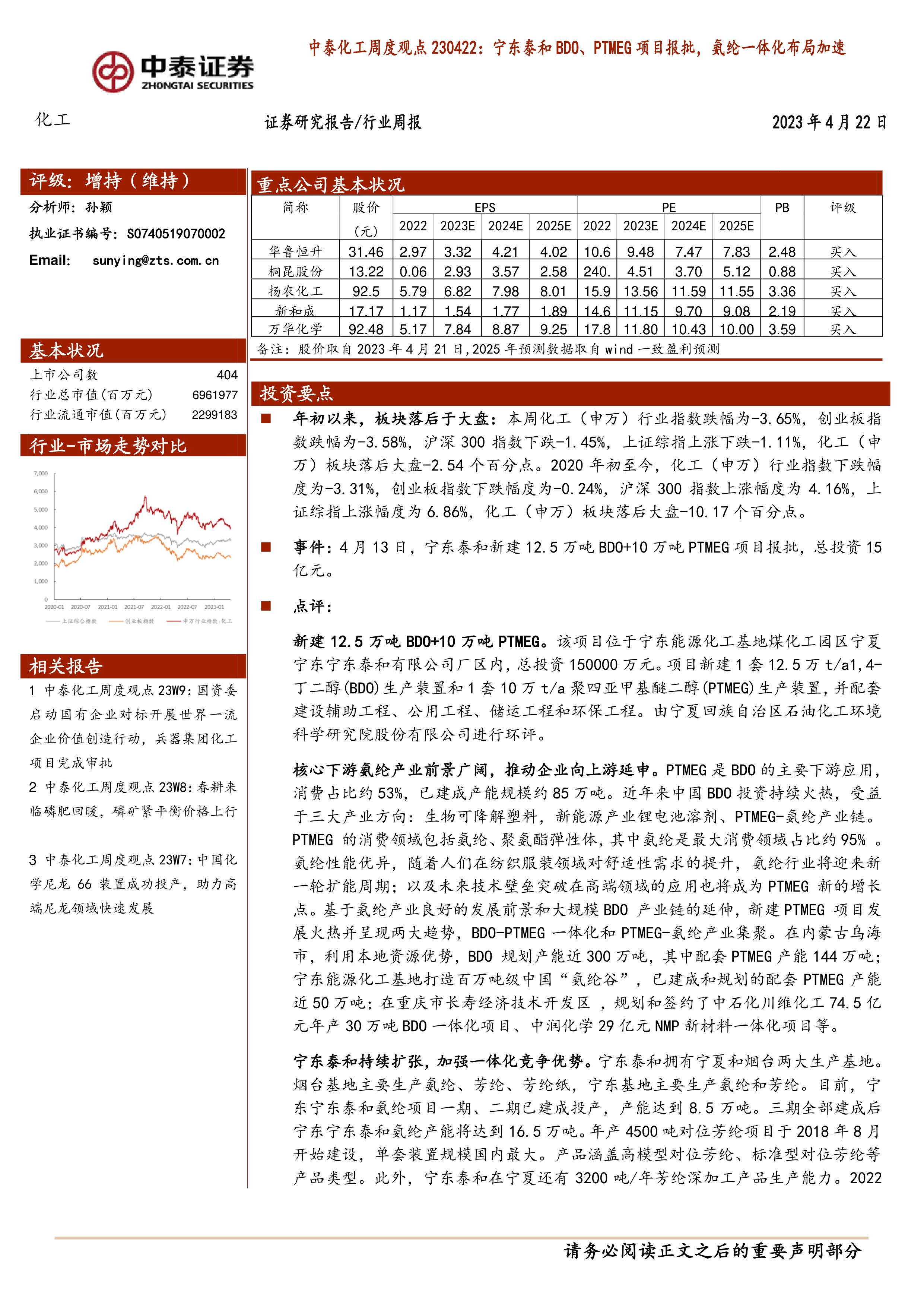 本报告通过对化工板块整体表现、个股动态、重点新闻事件以及化工产品价格和价差的分析,全面展现了本周化工行业的市场状况。宁东泰和的氨纶一体化布局加速是本周的重点事件,体现了行业发展趋势。报告同时指出了未来投资的主要方向,并提示了相应的风险,为投资者提供了有价值的参考信息。 报告数据主要来源于Wind数据库,并结合了中泰证券研究所的研究观点。 投资者需谨慎参考,并自行进行风险评估。