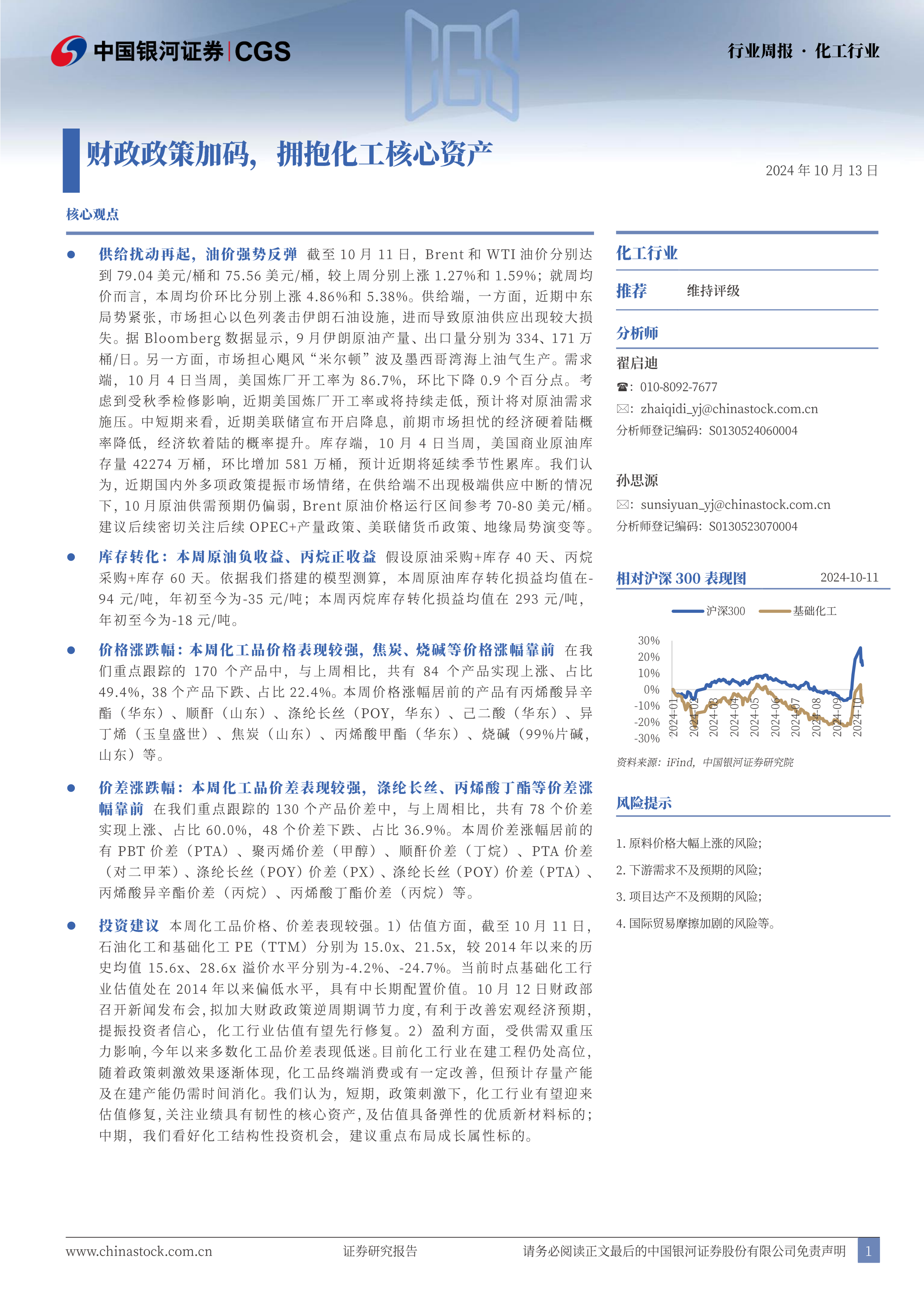 投资建议:本周化工品价格、价差表现较强。1)估值方面,截至10月11日,石油化工和基础化工PE(TTM)分别为15.0x、21.5x,较2014年以来的历史均值15.6x、28.6x溢价水平分别为-4.2%、-24.7%。当前时点基础化工行业估值处在2014年以来偏低水平,具有中长期配置价值。10月12日财政部召开新闻发布会,拟加大财政政策逆周期调节力度,有利于改善宏观经济预期,提振投资者信心,化工行业估值有望先行修复。2)盈利方面,受供需双重压力影响,今年以来多数化工品价差表现低迷。目前化工行业在建工程仍处高位,随着政策刺激效果逐渐体现,化工品终端消费或有一定改善,但预计存量产能及在建产能仍需时间消化。我们认为,短期,政策刺激下,化工行业有望迎来估值修复,关注业绩具有韧性的核心资产,及估值具备弹性的优质新材料标的;中期,我们看好化工结构性投资机会,建议重点布局成长属性标的。