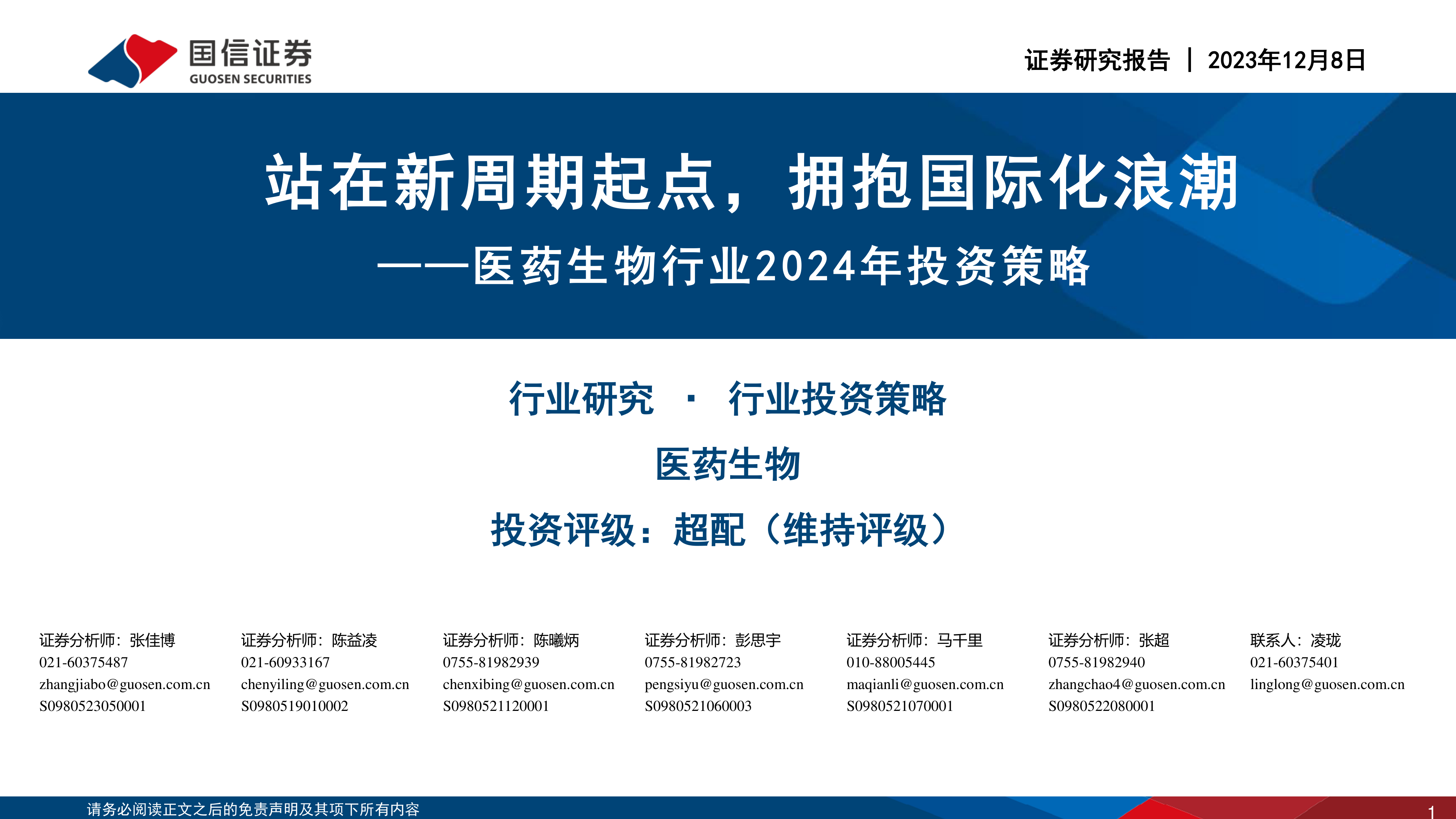 医药生物行业2024年投资策略:站在新周期起点,拥抱国际化浪潮
