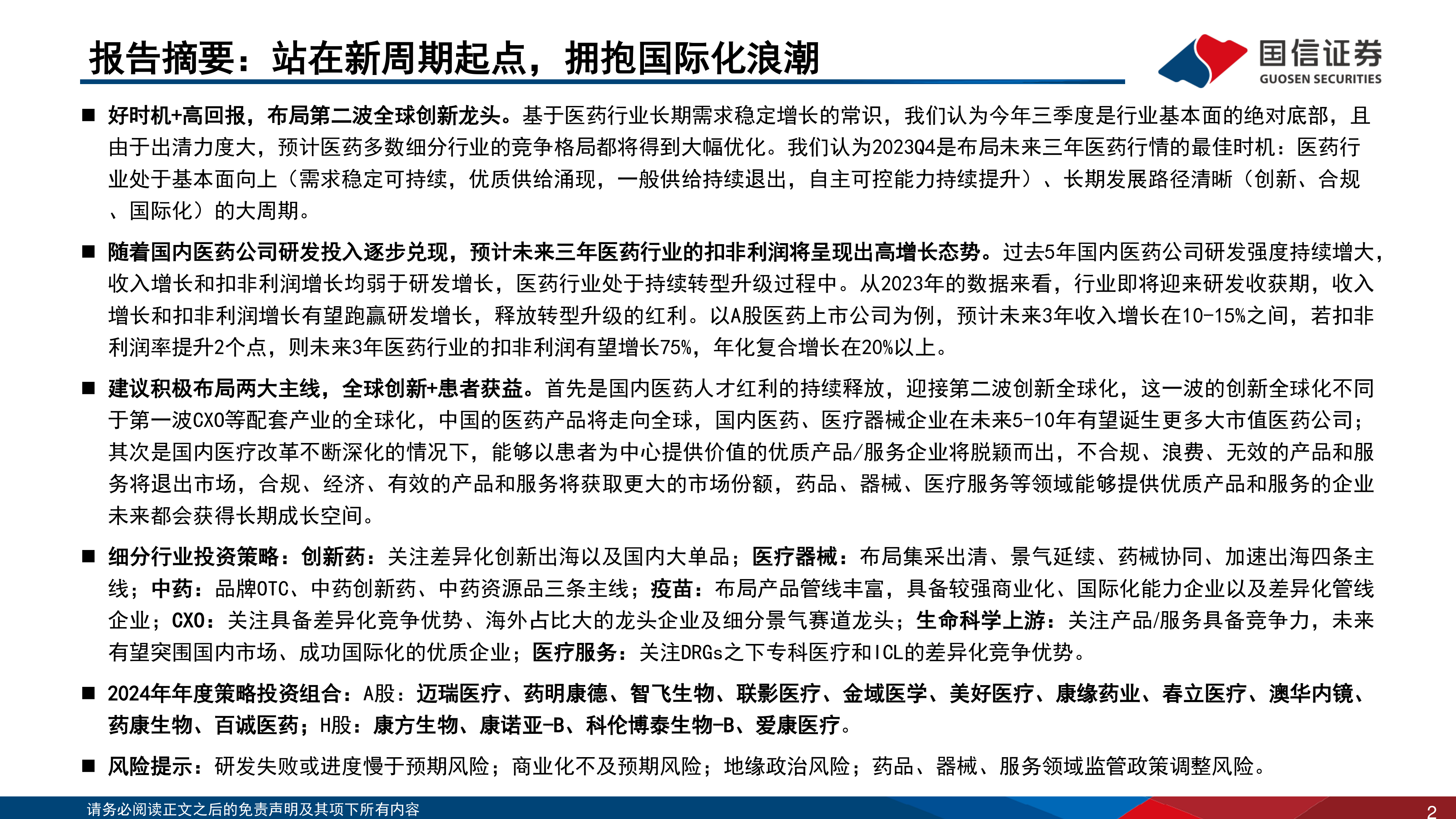 本节总结了报告的主要内容,并给出了2024年A+H医药投资策略组合,包括A股和H股推荐标的,以及相应的投资评级。同时,报告也列出了相应的风险提示。