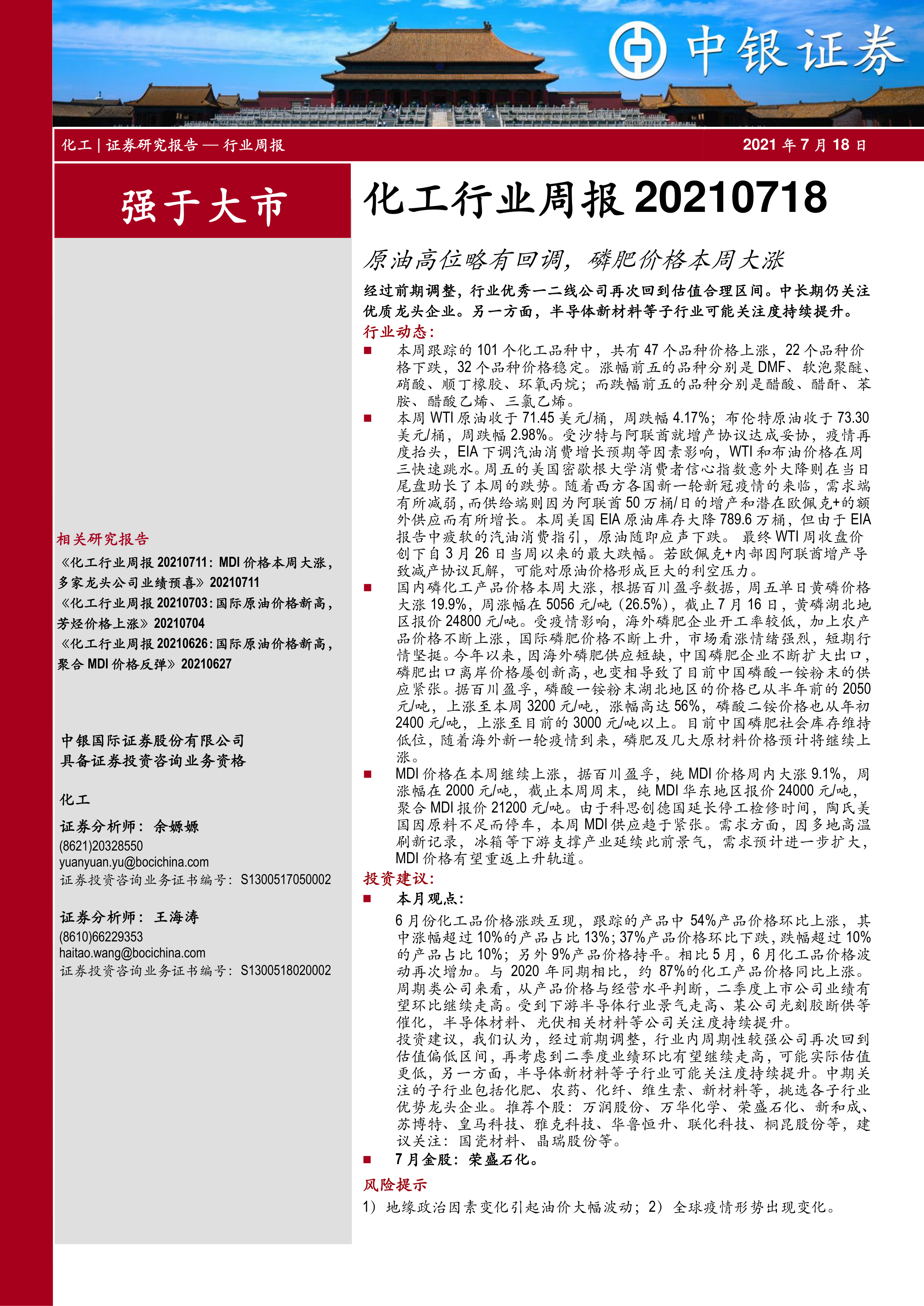 本报告的核心观点是:2021年7月18日当周,化工行业表现强于大市。原油价格小幅回调,但磷肥和MDI价格大幅上涨,推动部分化工产品价格上涨。经过前期调整,行业优秀一二线公司估值回归合理区间,中长期仍值得关注。半导体新材料等子行业关注度持续提升。