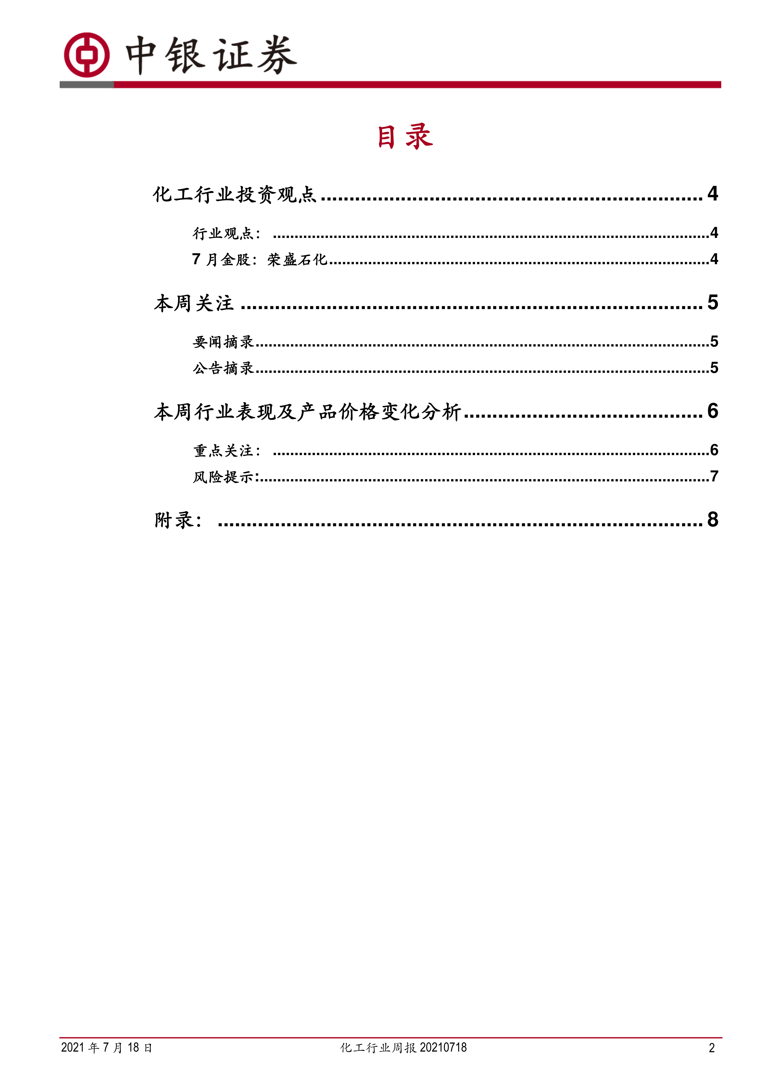 本报告对2021年7月18日当周化工行业进行了全面分析,指出行业整体表现强于大市,部分产品价格波动剧烈。磷肥和MDI价格大幅上涨是本周化工市场的主要特征。经过前期调整,行业优秀一二线公司估值回归合理区间,中长期仍值得关注。半导体新材料等子行业关注度持续提升。报告提供了具体的投资建议,并附带了详细的图表数据,为投资者提供了有价值的参考信息。 然而,报告也指出了地缘政治因素和全球疫情形势变化可能带来的风险。