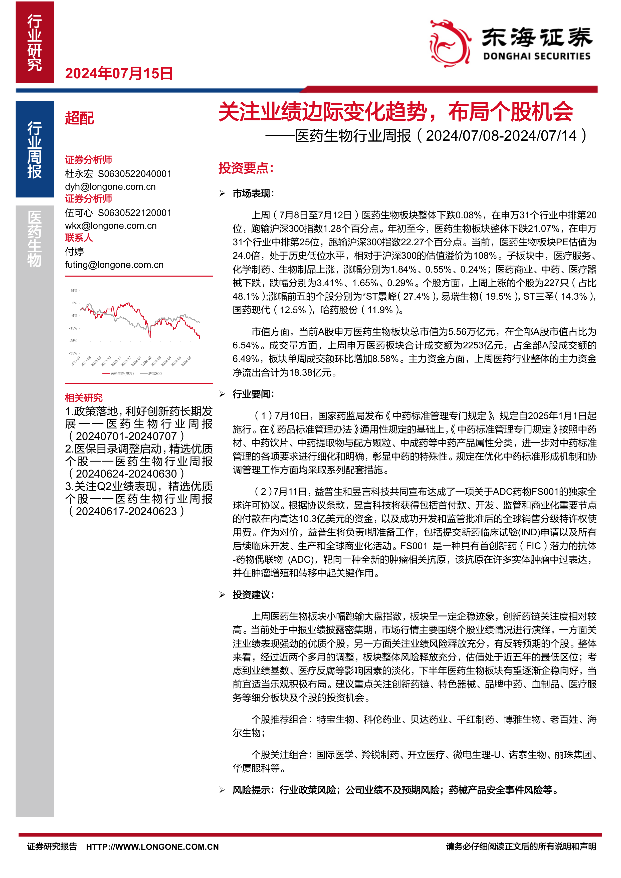 本报告对医药生物板块上周的市场表现、行业动态以及未来投资机会进行了全面分析。报告指出,尽管板块短期内表现略逊于大盘,但估值处于历史低位,且利好政策频出,创新药发展势头强劲,下半年板块有望企稳向好。报告建议投资者关注业绩优良的个股以及具有高增长潜力的细分板块,并提供了相应的投资建议和风险提示。 需要注意的是,报告中提到的个股仅供参考,投资者应根据自身风险承受能力和投资目标进行独立判断。