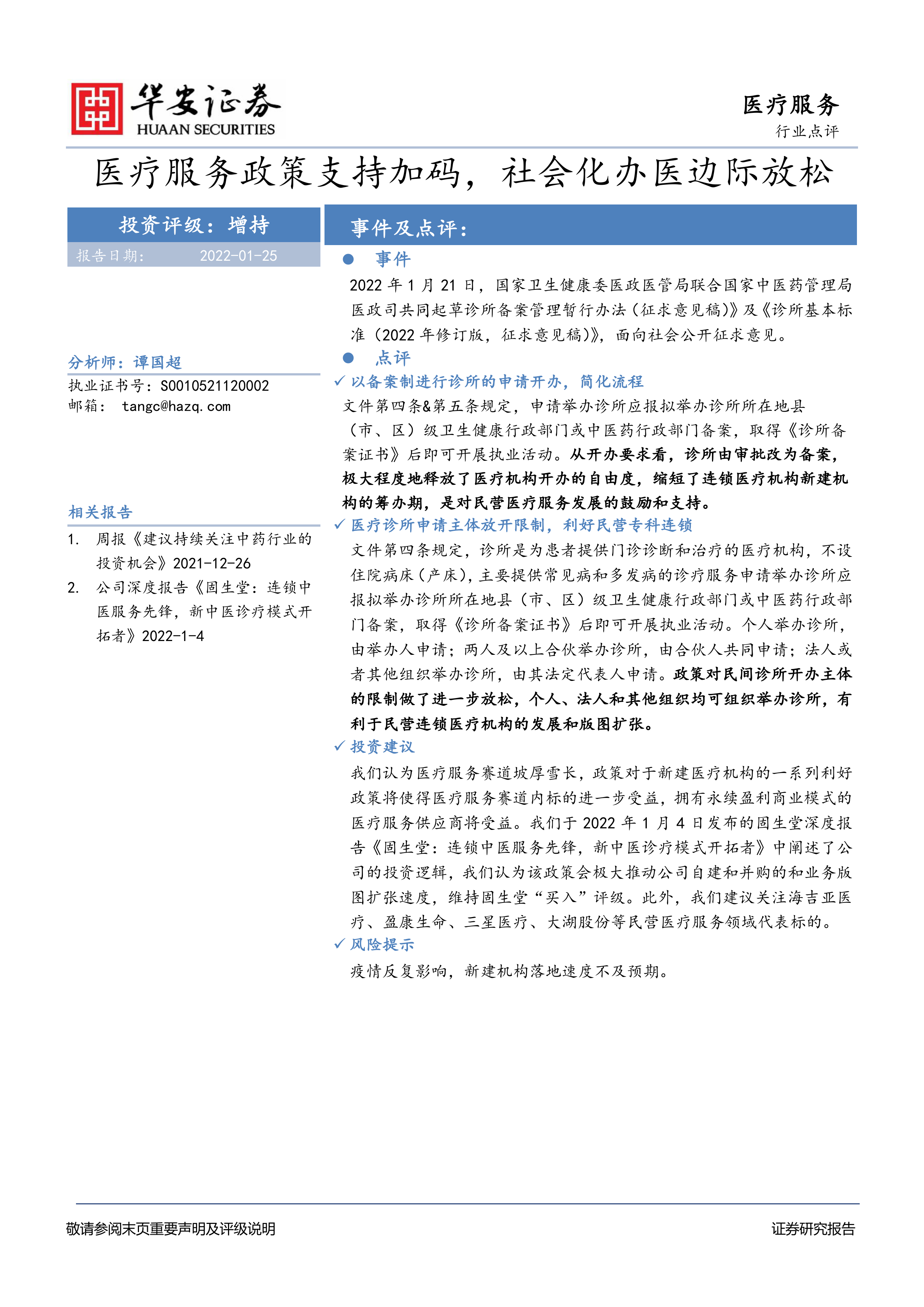我们认为医疗服务赛道坡厚雪长,政策对于新建医疗机构的一系列利好政策将使得医疗服务赛道内标的进一步受益,拥有永续盈利商业模式的医疗服务供应商将受益。我们于2022年1月4日发布的固生堂深度报告《固生堂:连锁中医服务先锋,新中医诊疗模式开拓者》中阐述了公司的投资逻辑,我们认为该政策会极大推动公司自建和并购的和业务版图扩张速度,维持固生堂“买入”评级。此外,我们建议关注海吉亚医疗、盈康生命、三星医疗、大湖股份等民营医疗服务领域代表标的。