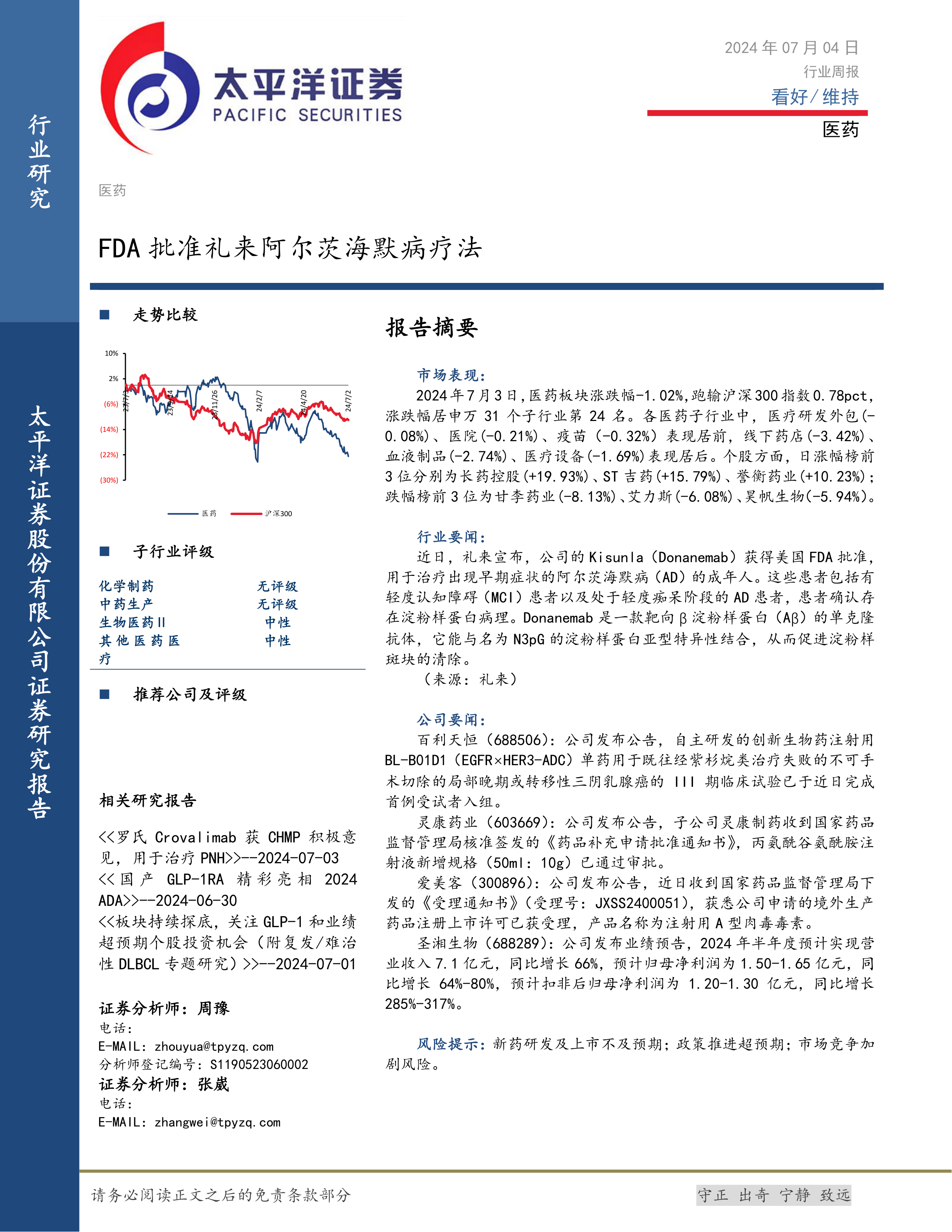 本报告的核心观点是:医药行业整体表现略显低迷,但个别细分领域和公司表现突出。礼来公司阿尔茨海默病新药获批是行业利好消息,推动了市场对相关领域的关注。同时,部分公司业绩增长强劲,展现出医药行业发展活力。然而,线下药店、血液制品和医疗设备等细分领域表现不佳,市场存在一定风险。