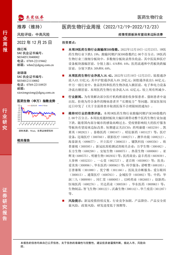本报告对2022年12月19日至23日SW医药生物行业进行了全面分析,数据显示行业整体表现弱于大盘,但部分细分板块和个股表现较好。 陆股通资金持续流入,但流入规模有所减少。 行业政策和公司公告也对行业发展产生重要影响。 报告维持对医药生物行业的推荐评级,并建议投资者关注多个细分领域的优质公司,同时需注意行业面临的各种风险。 报告数据主要来自Wind和东莞证券研究所,投资者需谨慎判断,风险自担。