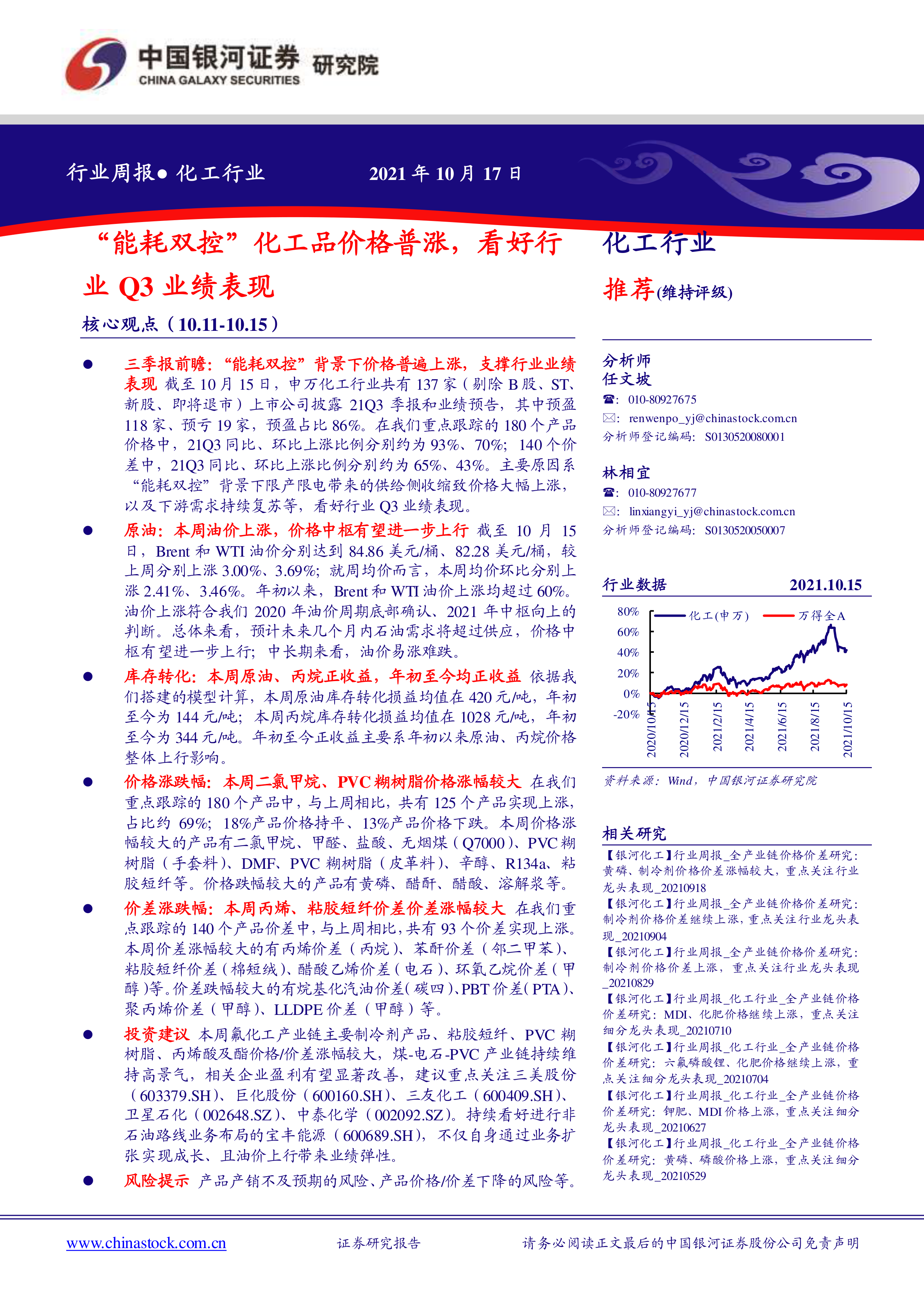 本报告基于对2021年第三季度化工行业数据的分析,指出“能耗双控”政策导致化工产品价格普遍上涨,从而支撑了行业业绩的增长。 报告从多个维度对行业市场表现进行了深入分析,并对未来走势进行了预测,为投资者提供了有价值的参考信息和投资建议。 然而,报告也提醒投资者需关注潜在的市场风险。