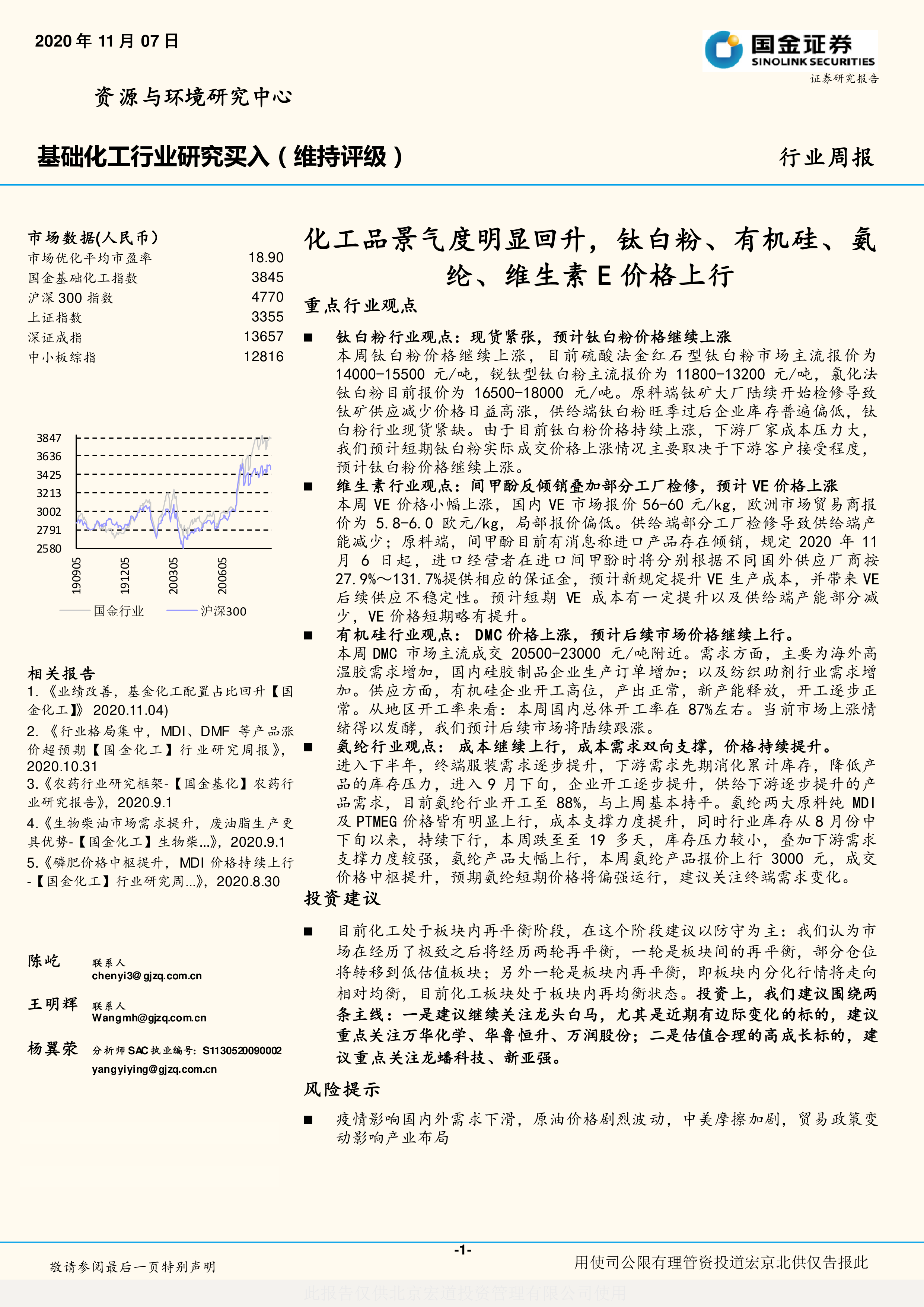 本报告基于市场数据和行业信息,对2020年11月基础化工行业进行了分析。报告指出,行业景气度明显回升,多种化工产品价格上涨,这主要源于供需关系的变化。报告建议投资者关注龙头白马股和估值合理的高成长标的,同时需注意潜在的市场风险。 报告提供了详细的市场数据和各子行业的分析,为投资者提供了有价值的参考信息。