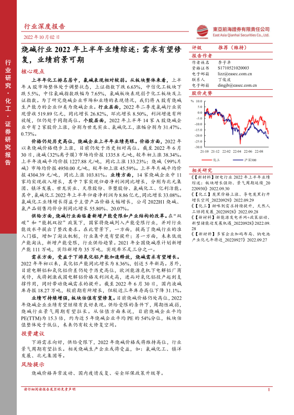烧碱行业2022年上半年业绩综述:需求有望修复,业绩前景可期