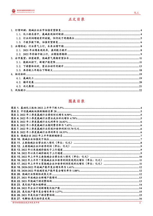 本报告的核心观点是:2022年上半年,尽管A股市场整体调整,但烧碱行业表现亮眼,业绩前景可期。这主要得益于烧碱价格持续上涨,处于历史高位,以及下游氧化铝产能的加速释放带来的需求增长。同时,受“双碳”和“能耗双控”政策影响,新增产能受限,供给趋紧,进一步支撑了烧碱价格和行业景气度。虽然部分烧碱企业股价下跌,但板块估值处于低位,未来有望修复。报告推荐关注氯碱化工、镇洋发展、北元集团等烧碱生产企业。