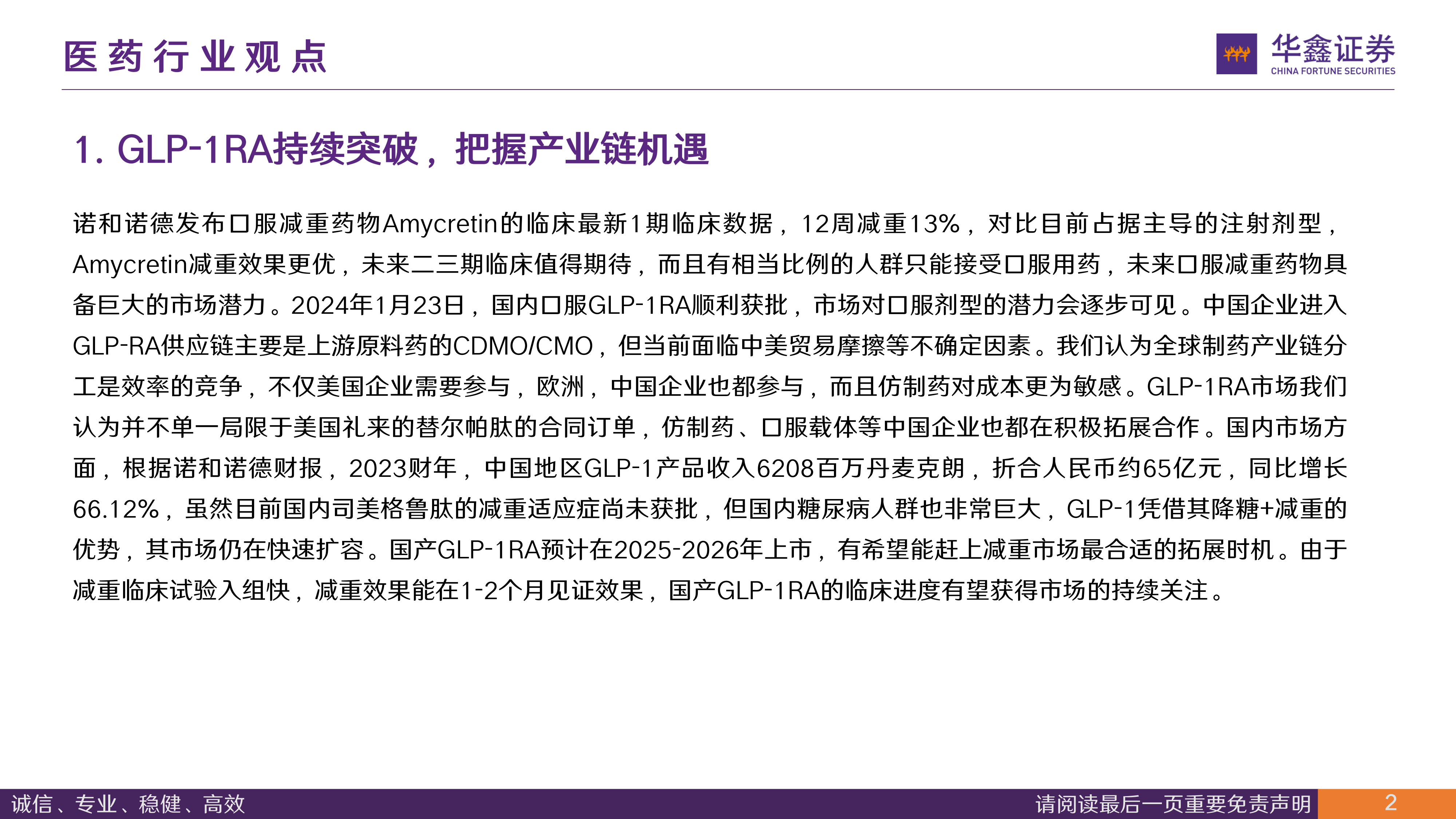 诺和诺德发布口服减重药物Amycretin的临床最新1期临床数据,12周减重13%,对比目前占据主导的注射剂型,Amycretin减重效果更优,未来二三期临床值得期待,而且有相当比例的人群只能接受口服用药,未来口服减重药物具备巨大的市场潜力。2024年1月23日,国内口服GLP-1RA顺利获批,市场对口服剂型的潜力会逐步可见。中国企业进入GLP-RA供应链主要是上游原料药的CDMO/CMO,但当前面临中美贸易摩擦等不确定因素。我们认为全球制药产业链分工是效率的竞争,不仅美国企业需要参与,欧洲,中国企业也都参与,而且仿制药对成本更为敏感。GLP-1RA市场我们认为并不单一局限于美国礼来的替尔帕肽的合同订单,仿制药、口服载体等中国企业也都在积极拓展合作。国内市场方面,根据诺和诺德财报,2023财年,中国地区GLP-1产品收入6208百万丹麦克朗,折合人民币约65亿元,同比增长66.12%,虽然目前国内司美格鲁肽的减重适应症尚未获批,但国内糖尿病人群也非常巨大,GLP-1凭借其降糖+减重的优势,其市场仍在快速扩容。国产GLP-1RA预计在2025-2026年上市,有希望能赶上减重市场最合适的拓展时机。由于减重临床试验入组快,减重效果能在1-2个月见证效果,国产GLP-1RA的临床进度有望获得市场的持续关注。医药行业观点
