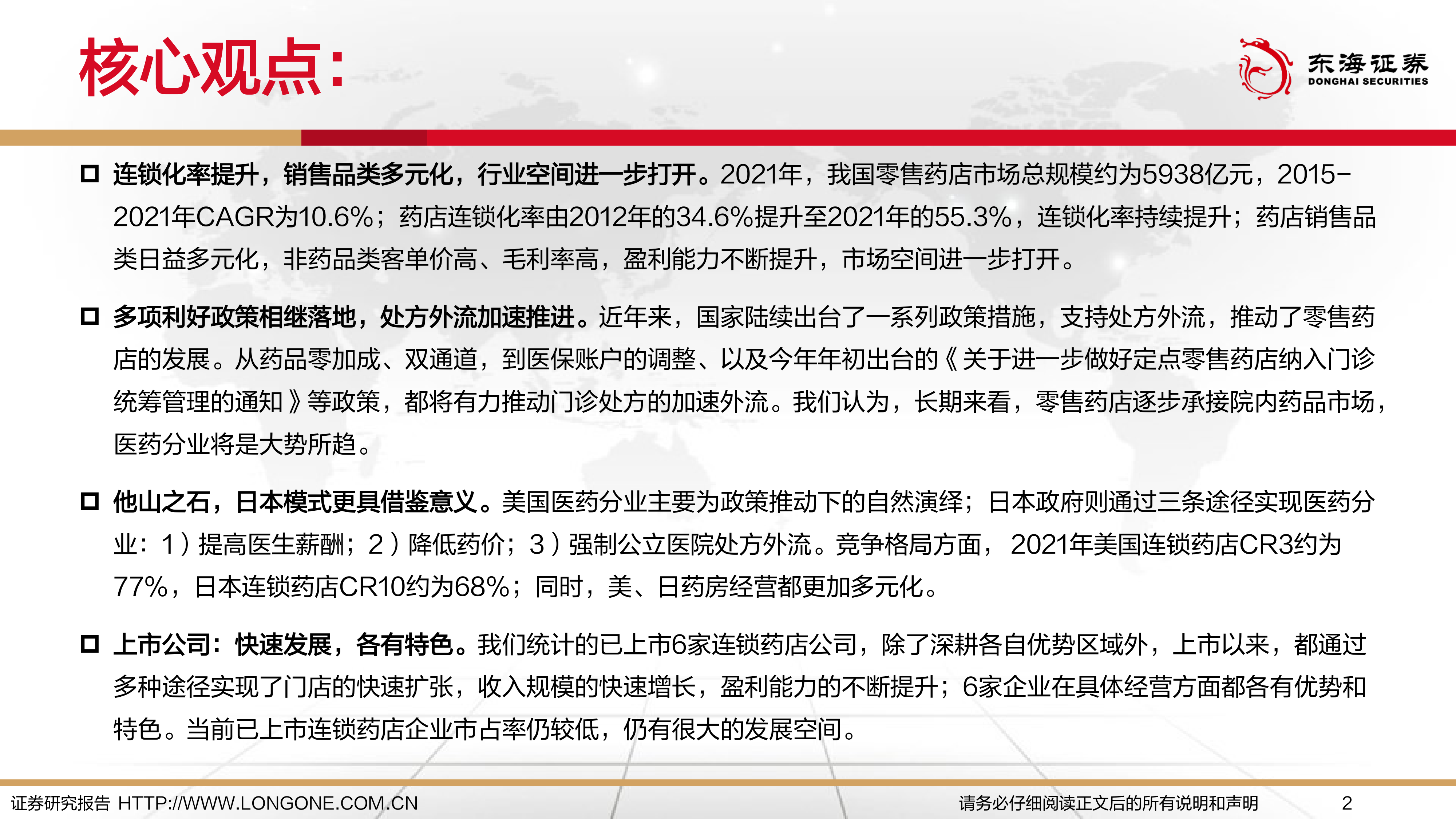 本报告的核心观点是:中国零售药店行业正处于快速发展阶段,连锁化率提升、品类多元化以及处方外流的加速推进共同打开了巨大的市场空间。 政策利好持续落地,为行业发展提供了强劲动力。 日本医药分业模式值得借鉴,而中国上市连锁药店公司也展现出快速发展和差异化竞争的态势,但仍面临扩张速度、竞争加剧和合规经营等风险。