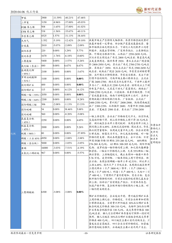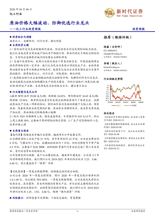 本报告基于2020年4月6日的市场数据,对化工行业进行了深入分析,并重点关注了原油价格波动、疫情影响以及行业龙头企业的发展。报告推荐了扬农化工、龙蟒佰利、利尔化学和联化科技四家公司,并对推荐理由进行了详细阐述。报告还对化工行业估值水平、外资投资动向以及部分重点化工产品的价格走势进行了分析,并提出了相应的风险提示。总而言之,报告建议投资者在当前市场环境下,优先选择具有护城河优势的化工行业龙头企业进行投资。