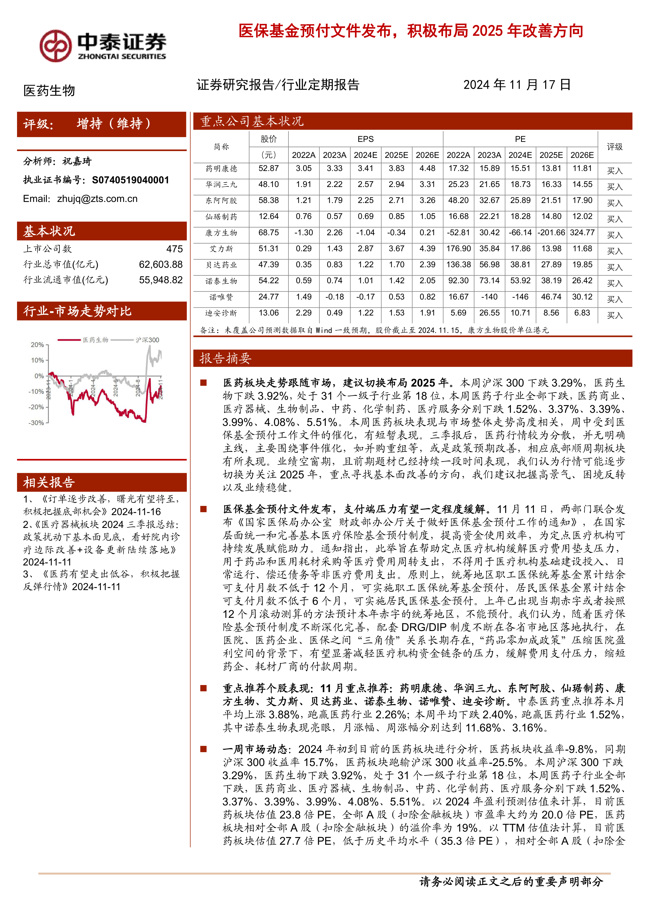本报告的核心观点是:医药板块近期走势与大盘高度相关,受医保基金预付政策催化后短暂上涨,但整体表现疲软。三季报后市场缺乏明确主线,建议投资者将投资策略转向2025年,关注基本面改善、高景气度、困境反转和业绩稳健的个股。医保基金预付政策的出台,将一定程度上缓解医疗机构的资金压力,改善行业支付端环境。