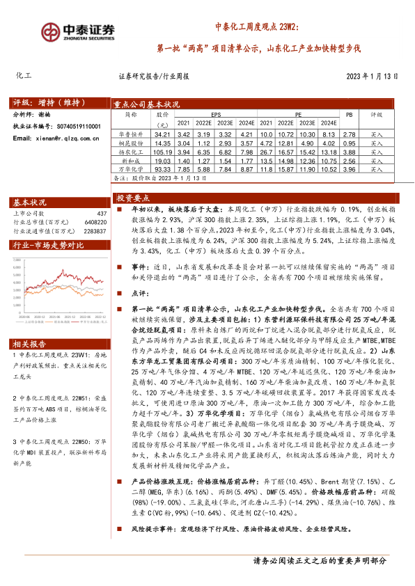 中泰化工周度观点23W2:第一批“两高”项目清单公示,山东化工产业加快转型步伐