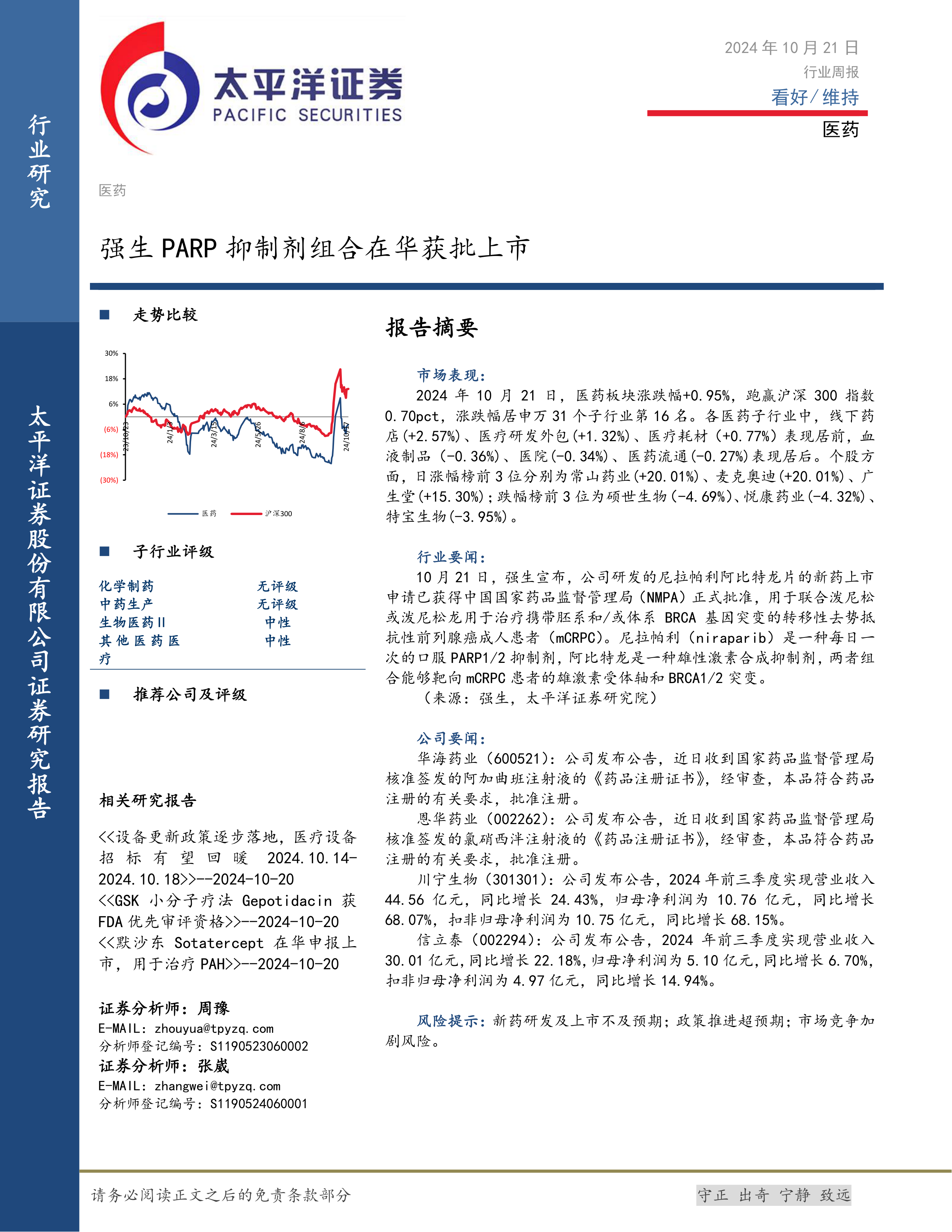 本报告的核心观点是:2024年10月21日,医药板块整体表现良好,跑赢沪深300指数,但个股涨跌分化明显。强生PARP抑制剂组合在华获批上市是本周医药行业的重要事件,对相关公司和市场具有积极影响。部分公司发布了前三季度业绩报告,显示出良好的增长态势。
