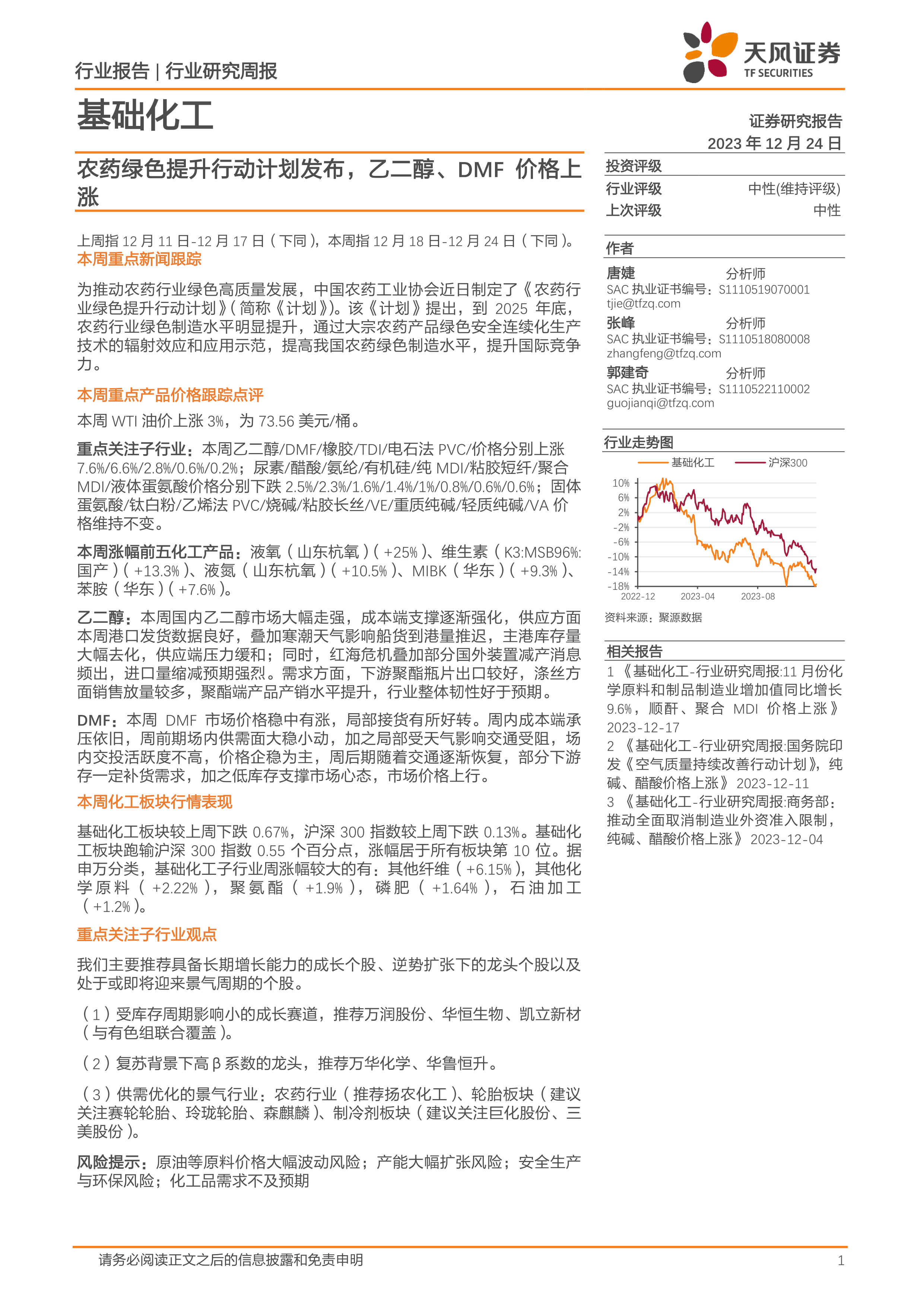基础化工行业研究周报:农药绿色提升行动计划发布,乙二醇、DMF价格上涨