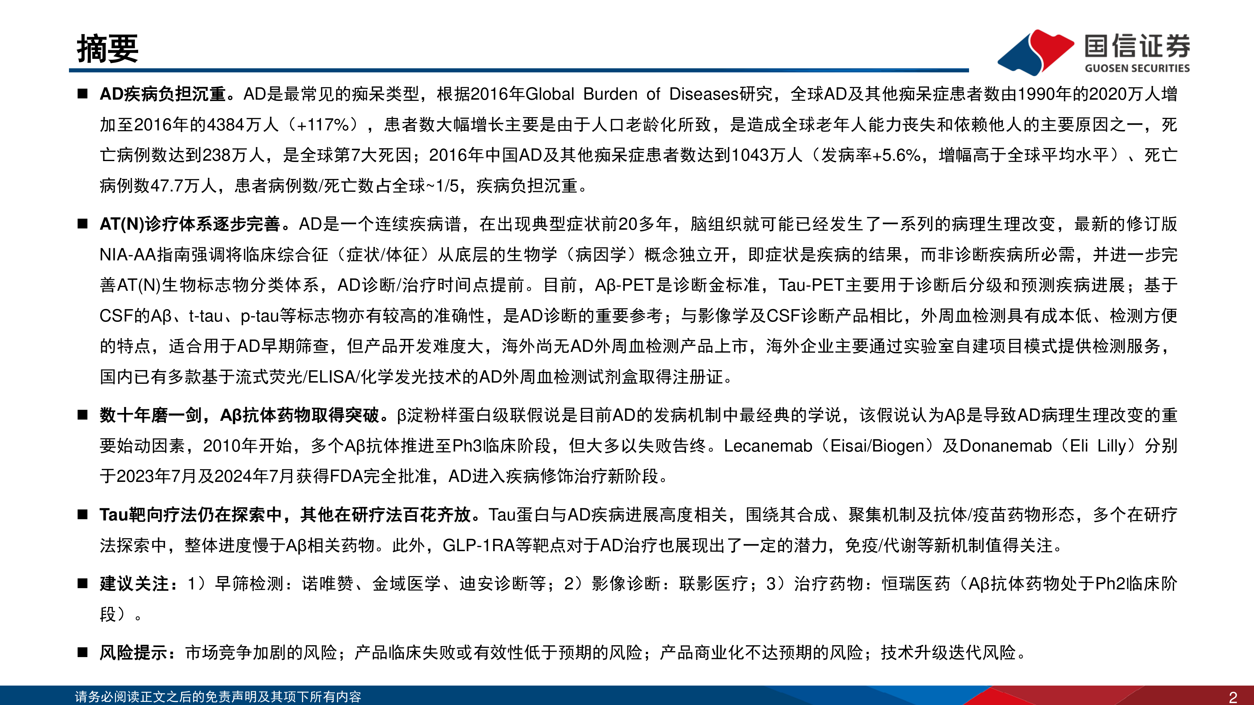 本报告的核心观点是:阿尔茨海默病(AD)的疾病负担日益沉重,但近年来AD的诊疗体系逐步完善,尤其在Aβ抗体药物方面取得突破性进展,标志着AD治疗进入疾病修饰治疗的新阶段。报告同时分析了Tau靶向疗法、其他在研疗法以及AD诊断市场,并对相关企业进行了投资建议。