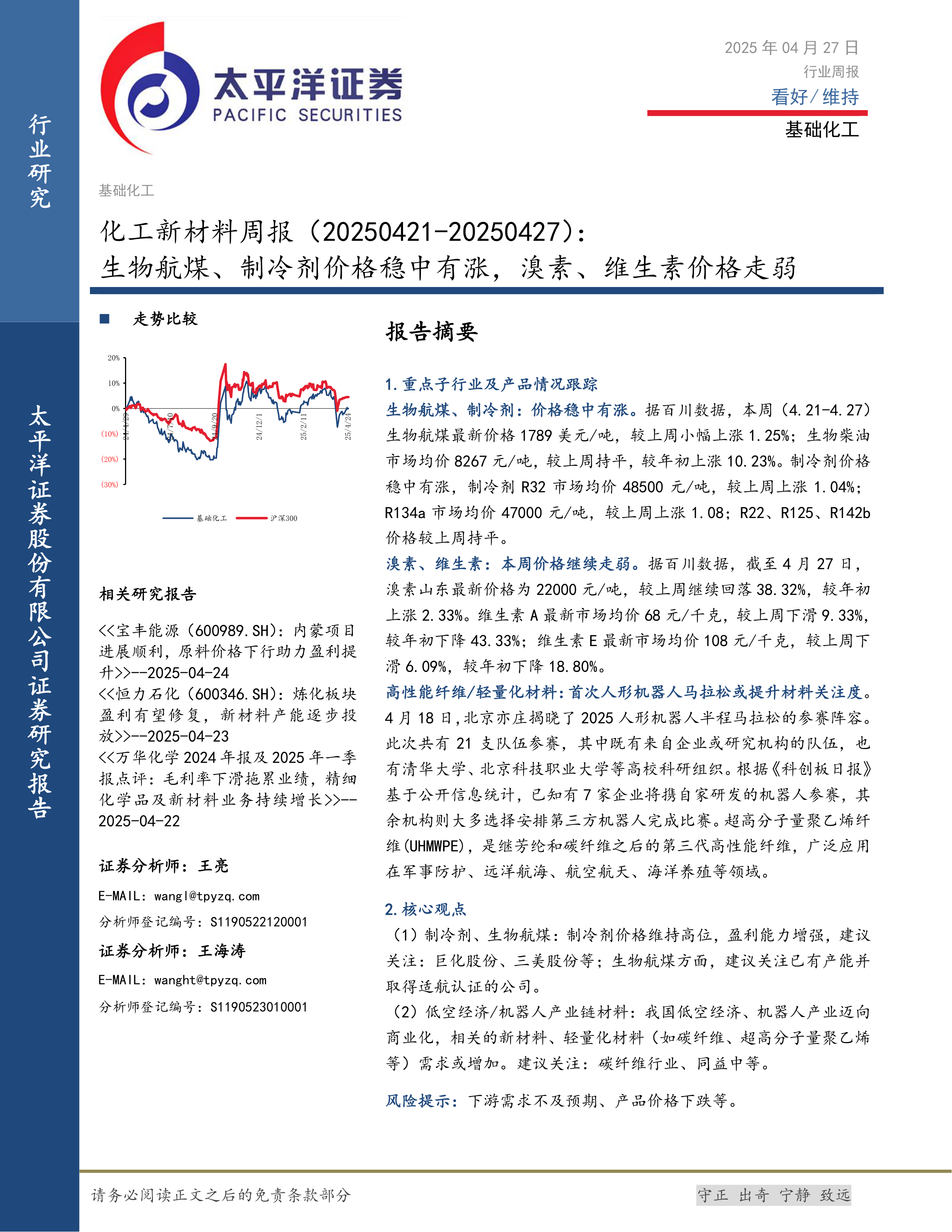 本报告基于2025年4月21日至2025年4月27日基础化工及化工新材料市场数据,对重点子行业及产品价格走势进行分析,并提出相应的投资建议。核心观点如下: