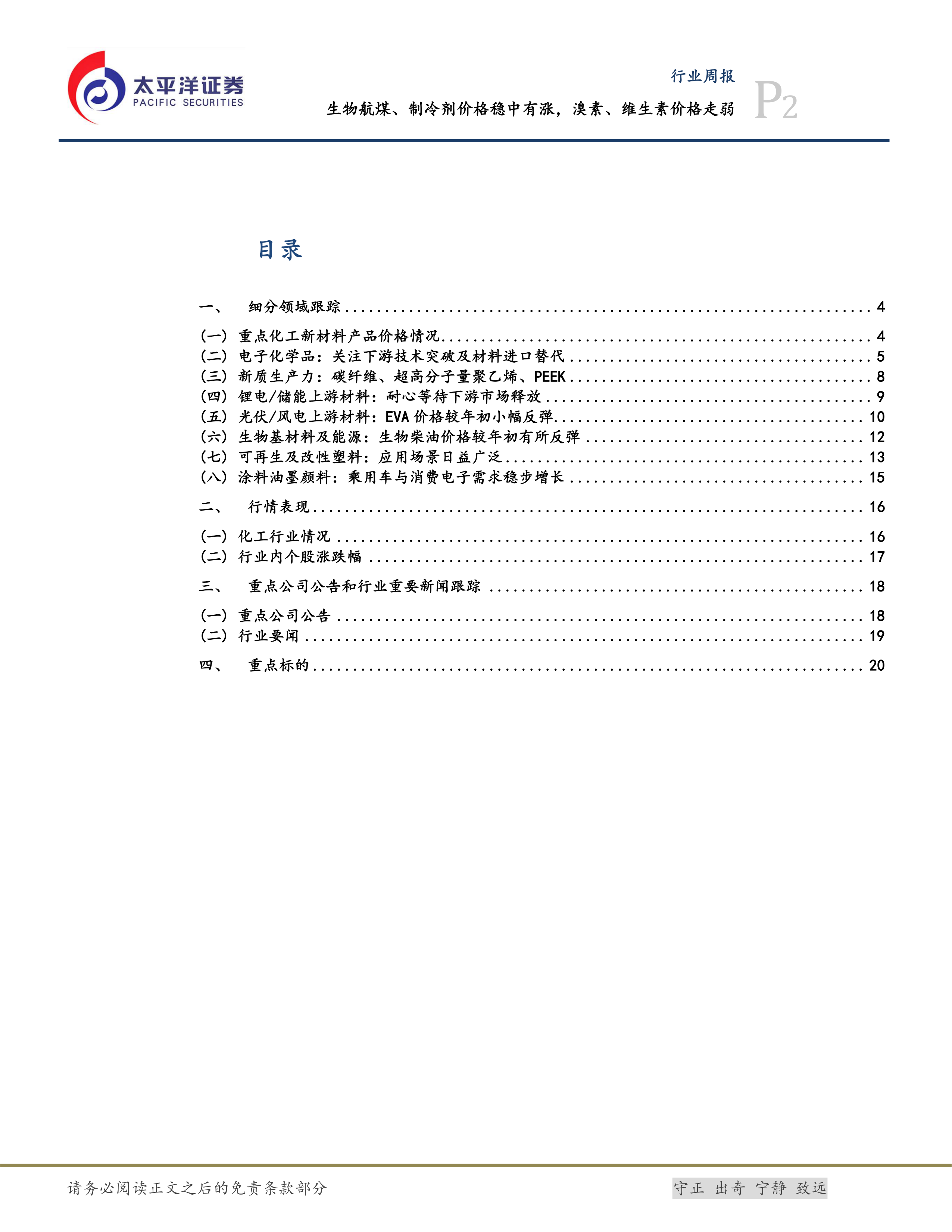 本小节重点关注了溴素、制冷剂、生物航煤和维生素的价格波动,并指出其他产品如己内酰胺、丙烯腈、有机硅、炭黑及POE价格也出现不同程度的下滑。