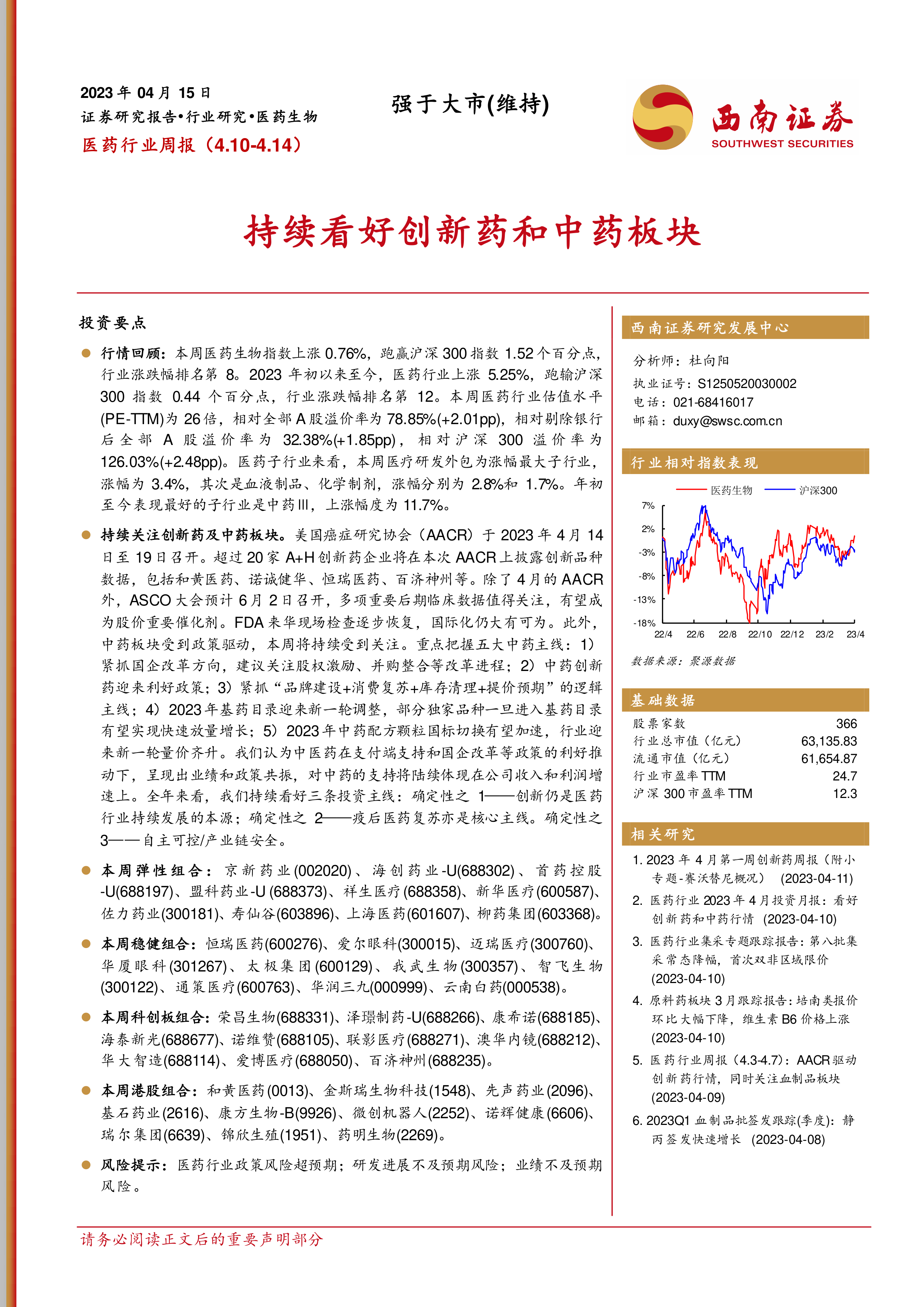 本周医药生物指数上涨0.76%,跑赢沪深300指数1.52个百分点,行业涨跌幅排名第8。年初至今,医药行业上涨5.25%,跑输沪深300指数0.44个百分点,行业涨跌幅排名第12。然而,中药板块表现突出,年初至今上涨11.7%,成为表现最好的子行业。 美国癌症研究协会(AACR)和ASCO大会即将召开,众多创新药企业将披露重要临床数据,有望成为股价催化剂。此外,中药板块持续受到政策驱动,国企改革、中药创新、消费复苏等因素将推动中药板块量价齐升。 因此,报告认为创新药和中药板块的长期增长潜力巨大。