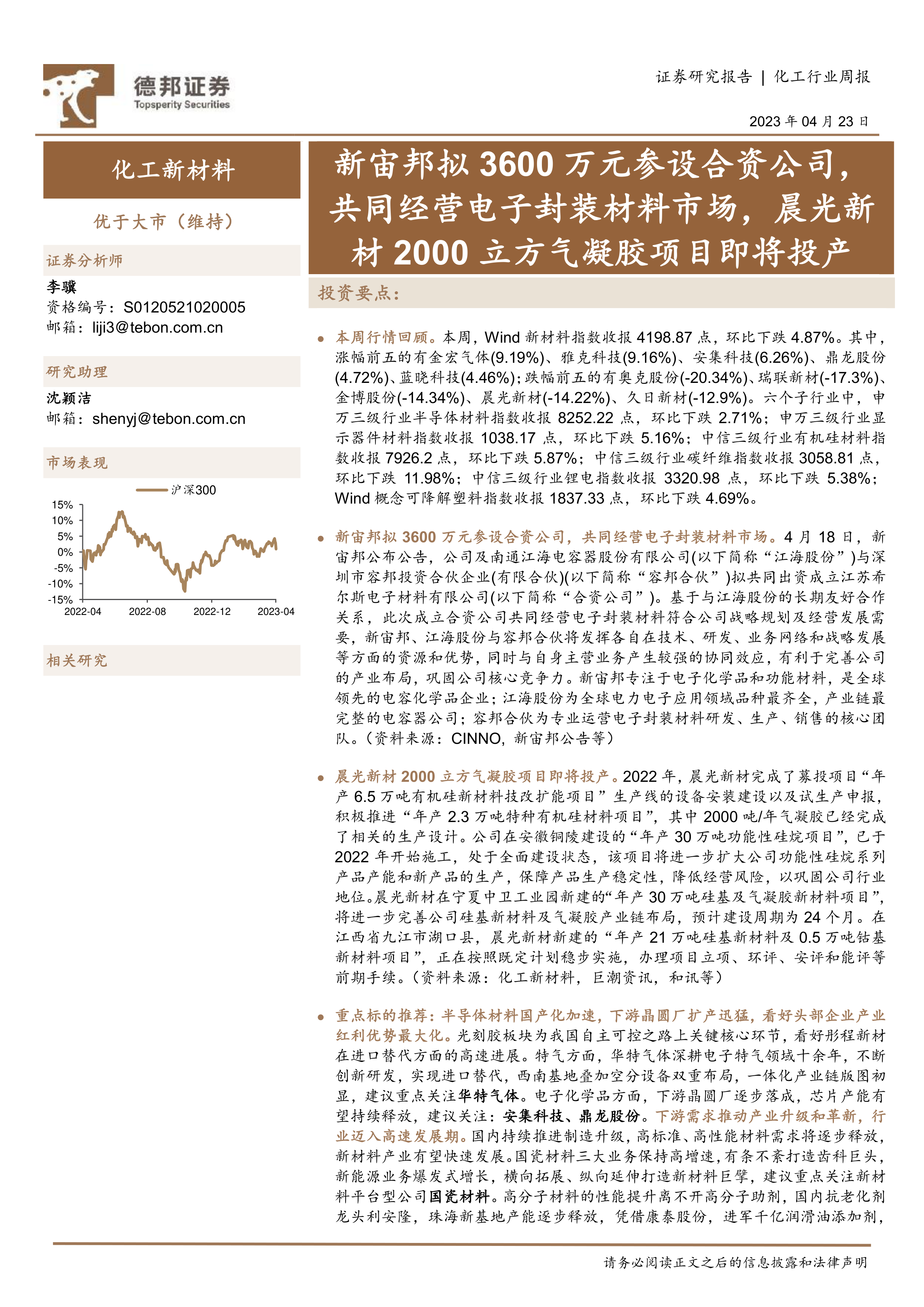 化工行业周报:新宙邦拟3600万元参设合资公司,共同经营电子封装材料市场,晨光新材2000立方气凝胶项目即将投产