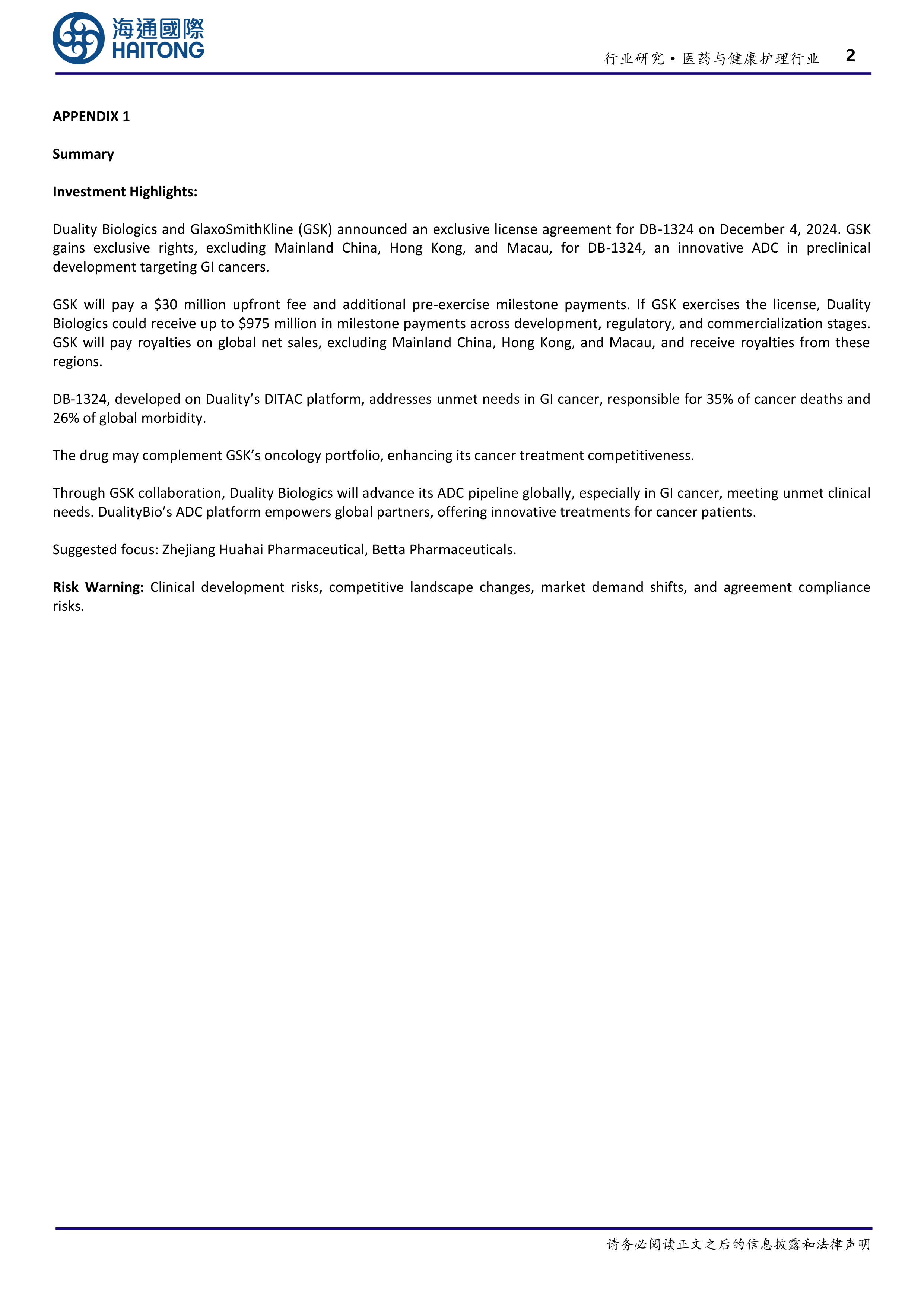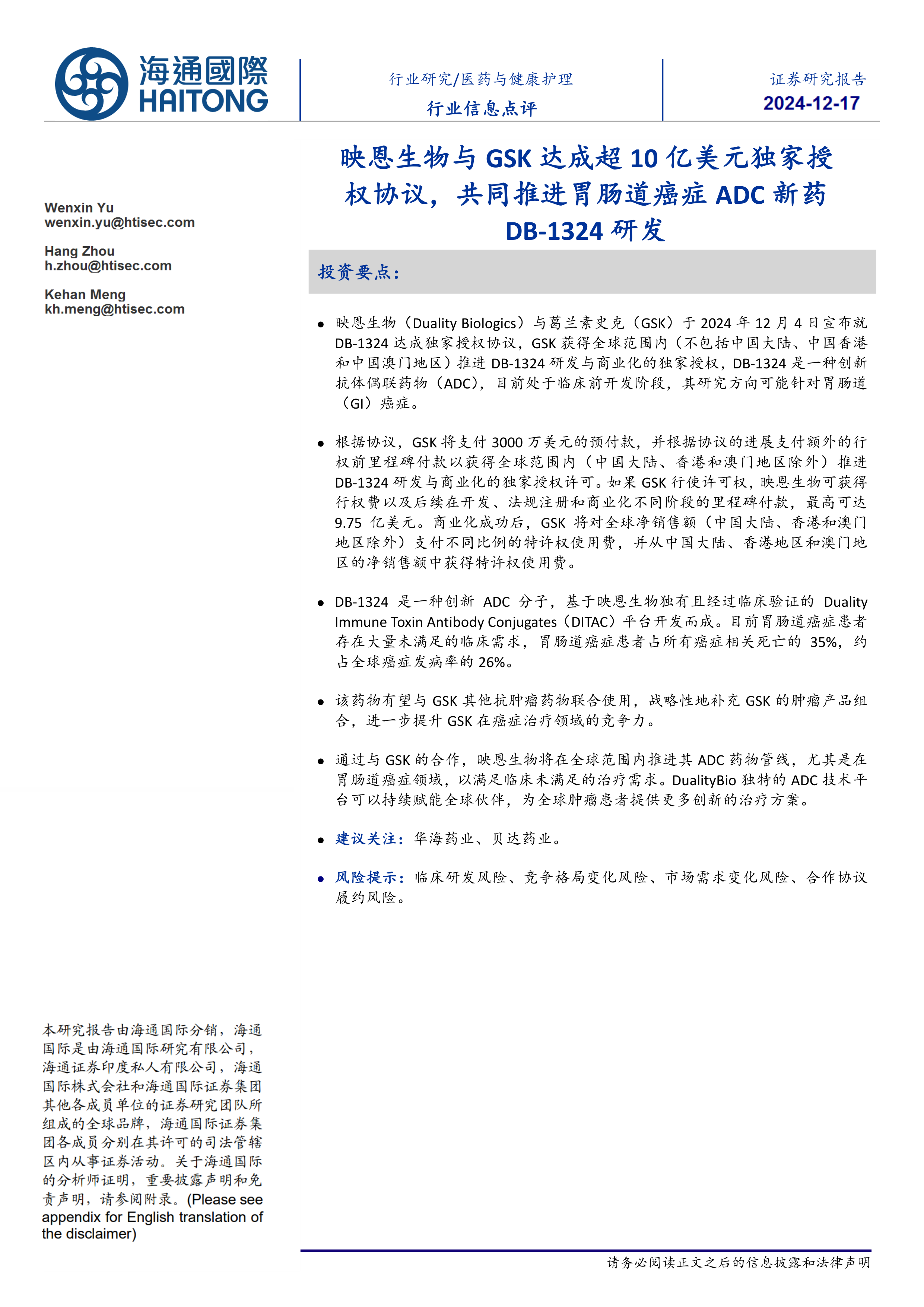 医药与健康护理行业信息点评:映恩生物与GSK达成超10亿美元独家授权协议,共同推进胃肠道癌症ADC新药DB-1324研发