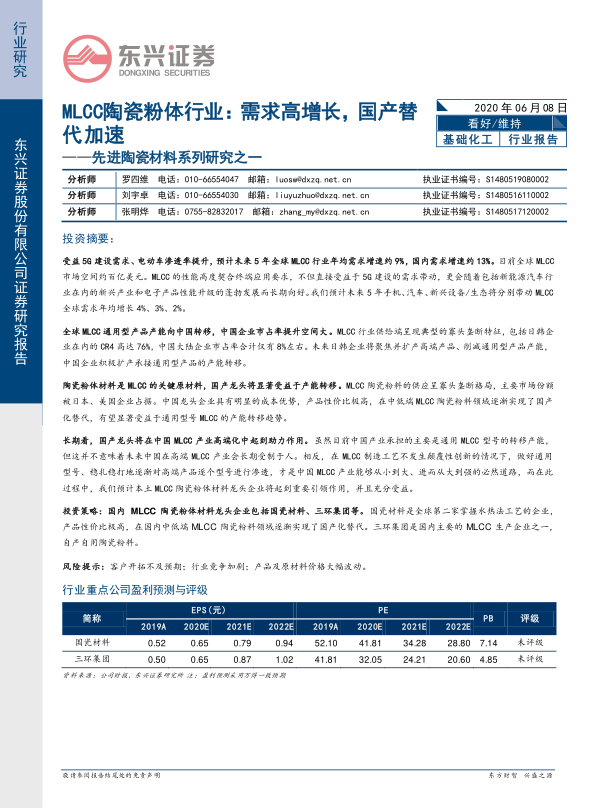 本报告的核心观点是:受益于5G建设和电动车渗透率提升,未来五年全球MLCC行业需求将保持高增长,年均增速约9%,国内市场增速更高,约13%。同时,全球MLCC产能正发生结构性变化,通用型产品产能向中国转移,这将显著利好国内MLCC陶瓷粉体材料龙头企业,如国瓷材料和三环集团。这些企业凭借成本优势和技术积累,有望在中低端市场实现国产替代,并逐步向高端市场渗透,助力中国MLCC产业高端化发展。