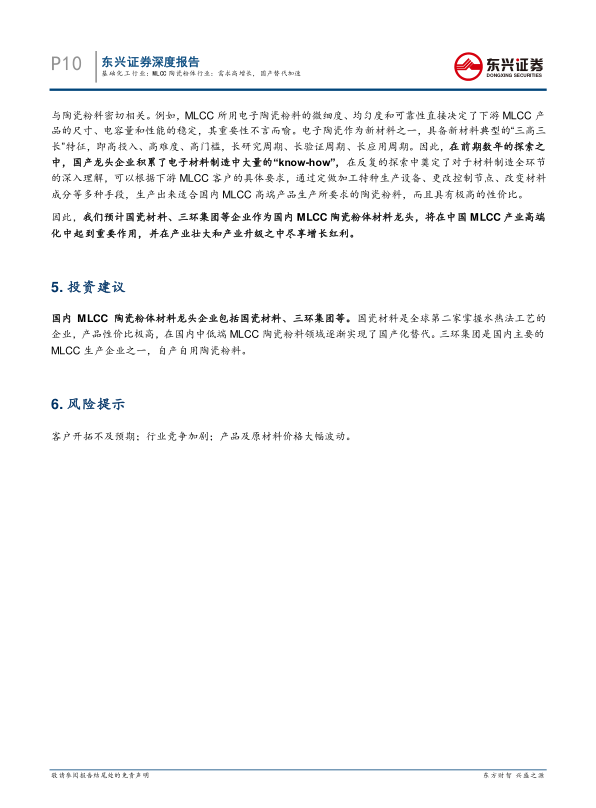 本报告基于对MLCC行业需求、供给、技术等方面的深入分析,预测未来五年MLCC行业将保持高增长,并指出通用型MLCC产能向中国转移的趋势。这一趋势将显著利好国内MLCC陶瓷粉体材料龙头企业,这些企业凭借成本优势和技术积累,有望在中低端市场实现国产替代,并逐步向高端市场渗透,最终助力中国MLCC产业实现高端化发展。报告建议关注国瓷材料和三环集团等国内MLCC陶瓷粉体材料龙头企业。 报告同时也指出了客户开拓不及预期、行业竞争加剧、产品及原材料价格大幅波动等潜在风险。