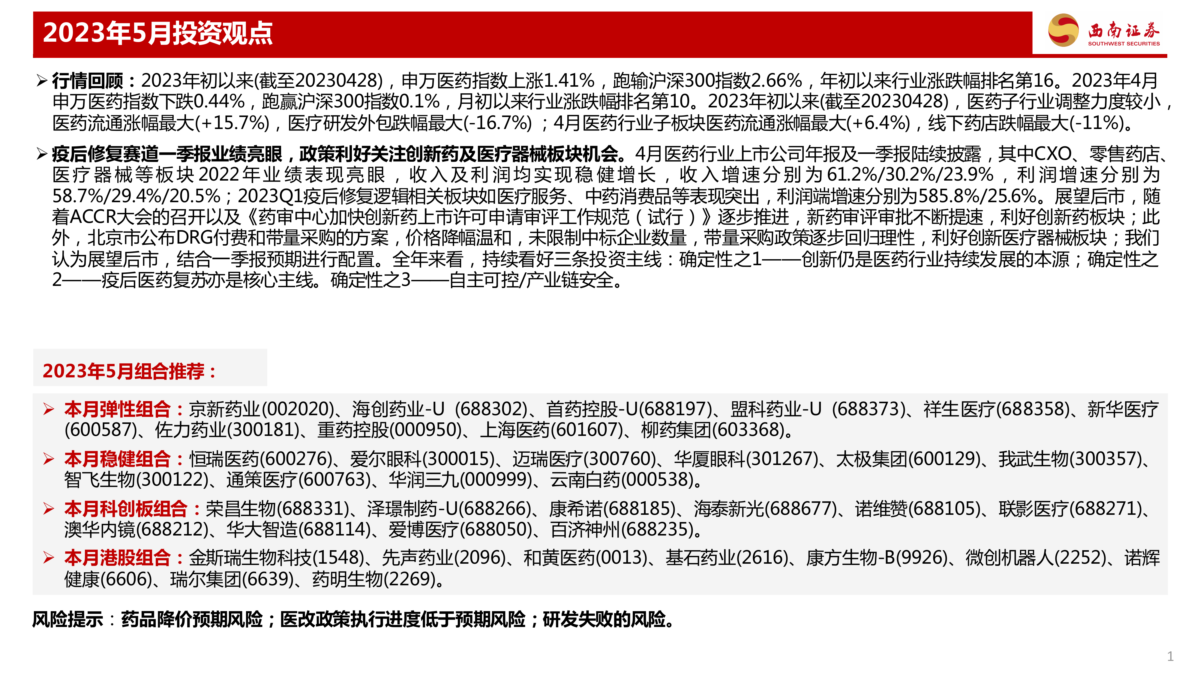 本报告的核心观点是:2023年5月医药行业整体表现呈现业绩分化,但后市行情值得看好。具体而言,报告指出疫后修复赛道一季报业绩亮眼,创新药和医疗器械板块受益于政策利好,未来发展潜力巨大。西南证券建议投资者关注创新、疫后复苏和产业链安全三大投资主线,并推荐了相应的弹性组合、稳健组合、科创板组合和港股组合。
