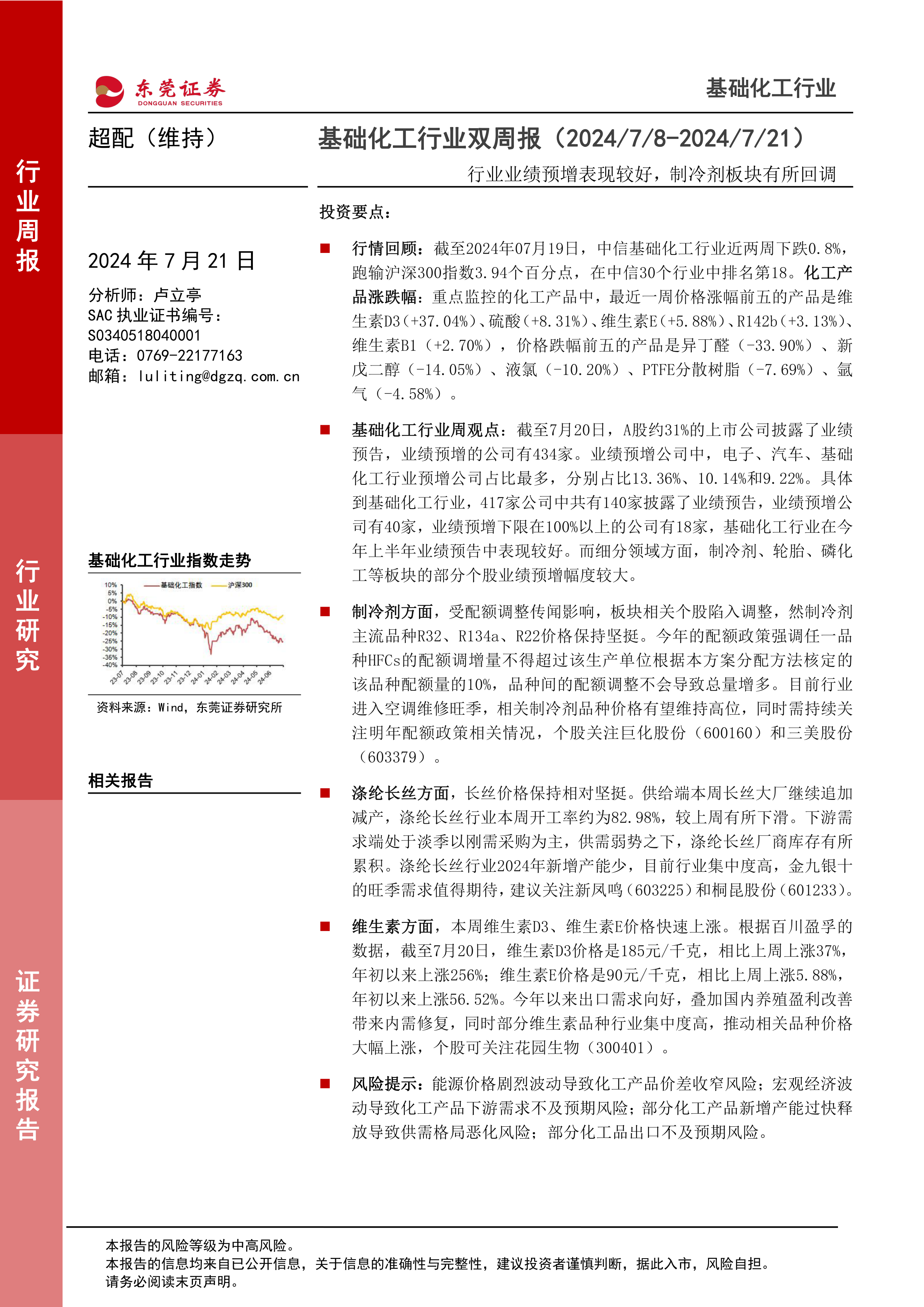 本报告的核心观点是:基础化工行业近期表现略逊于大盘,但部分细分领域表现强劲,整体维持超配评级。 具体而言,报告分析了行业整体走势、重点化工产品价格波动、部分细分行业(制冷剂、涤纶长丝、维生素)的市场动态以及部分上市公司的业绩预告,并在此基础上对行业未来走势进行了展望,并提示了相应的投资风险。