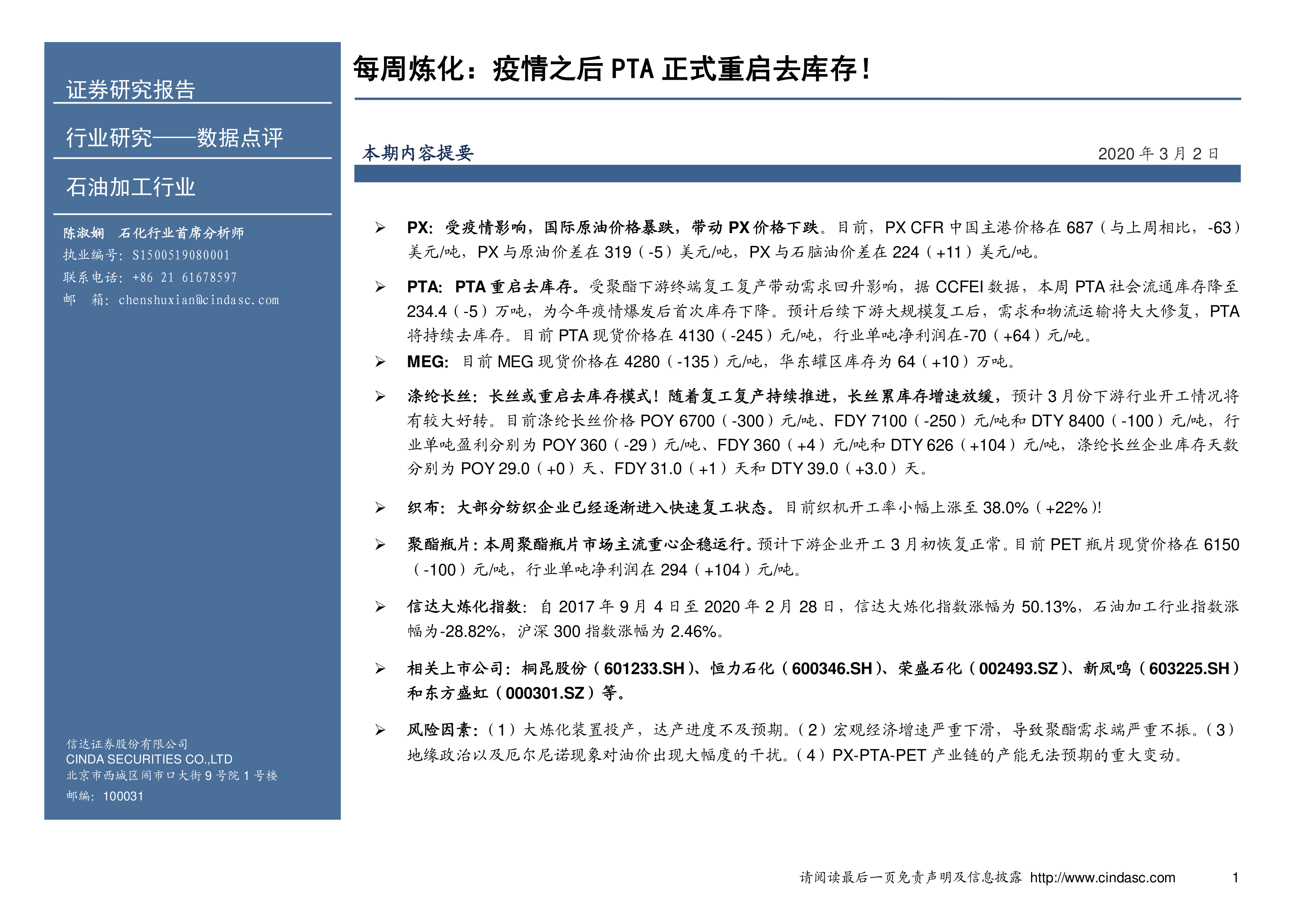 本报告以数据为基础,对疫情后PTA及相关石化行业市场进行了分析。报告涵盖了PX、PTA、MEG、涤纶长丝、织布、聚酯瓶片等多个细分市场,并对信达大炼化指数进行了解读。