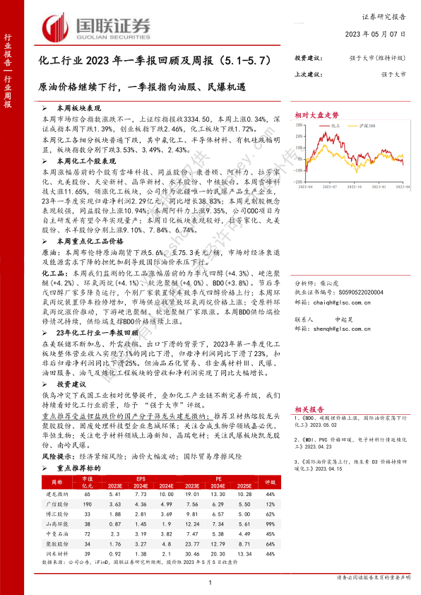 化工行业2023年一季报回顾及周报:原油价格继续下行,一季报指向油服、民爆机遇