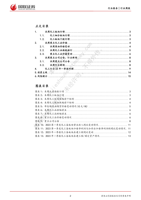 本报告以2023年5月1日至5月7日为时间范围,对化工行业进行了周报形式的分析,内容涵盖了市场行情、重点化工品价格、公司公告、行业新闻以及投资建议等方面。