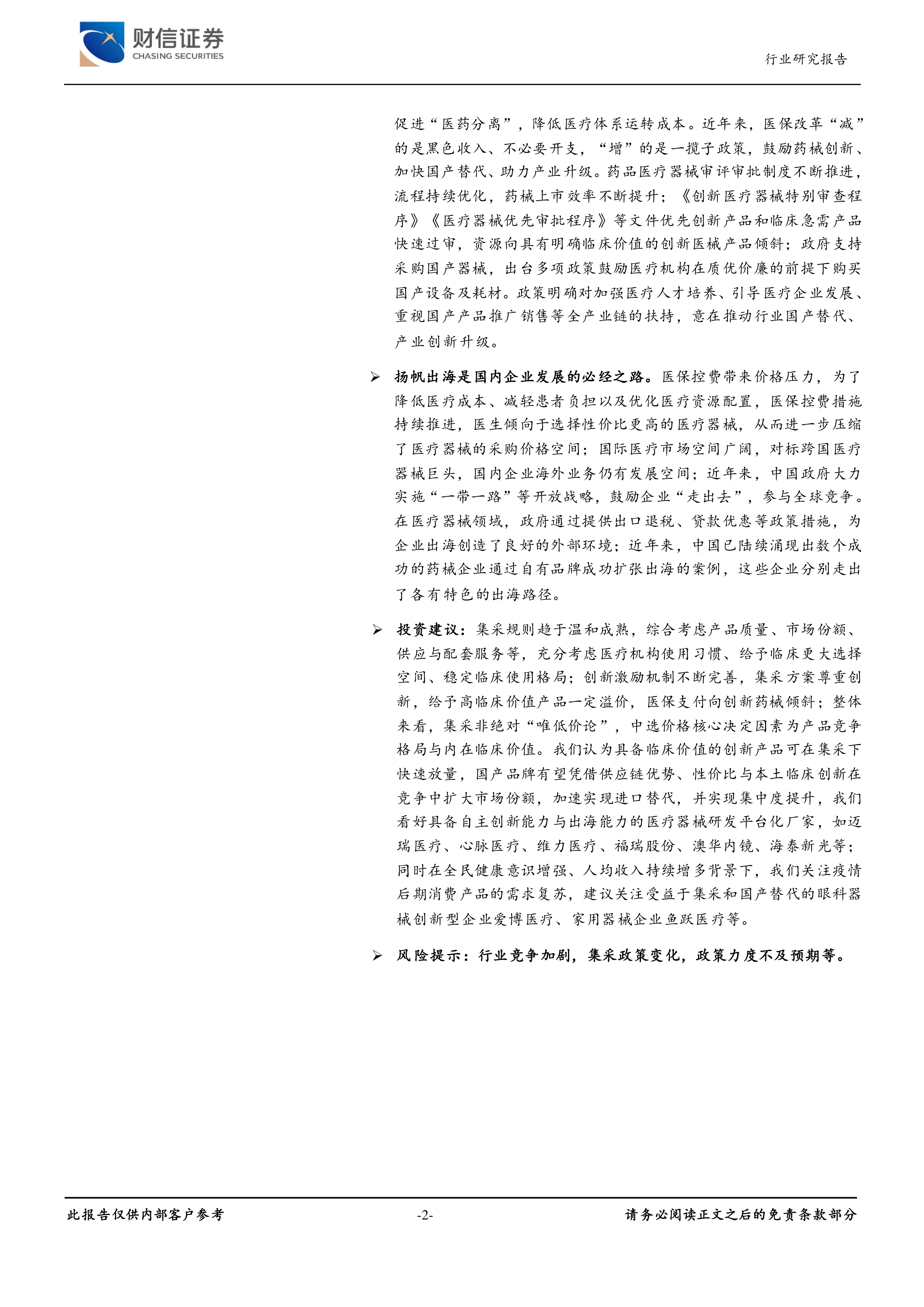 本章节列举了投资医疗器械行业的潜在风险,包括政策执行力度低于预期、集采降价幅度超预期以及供应链风险等。