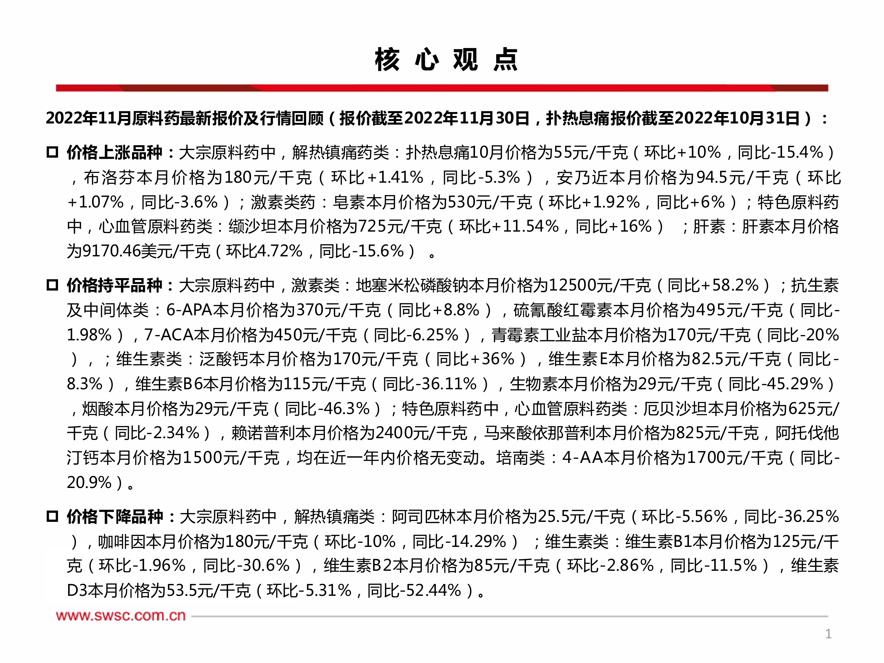 报告详细分析了2022年11月大宗原料药和特色原料药的价格走势。