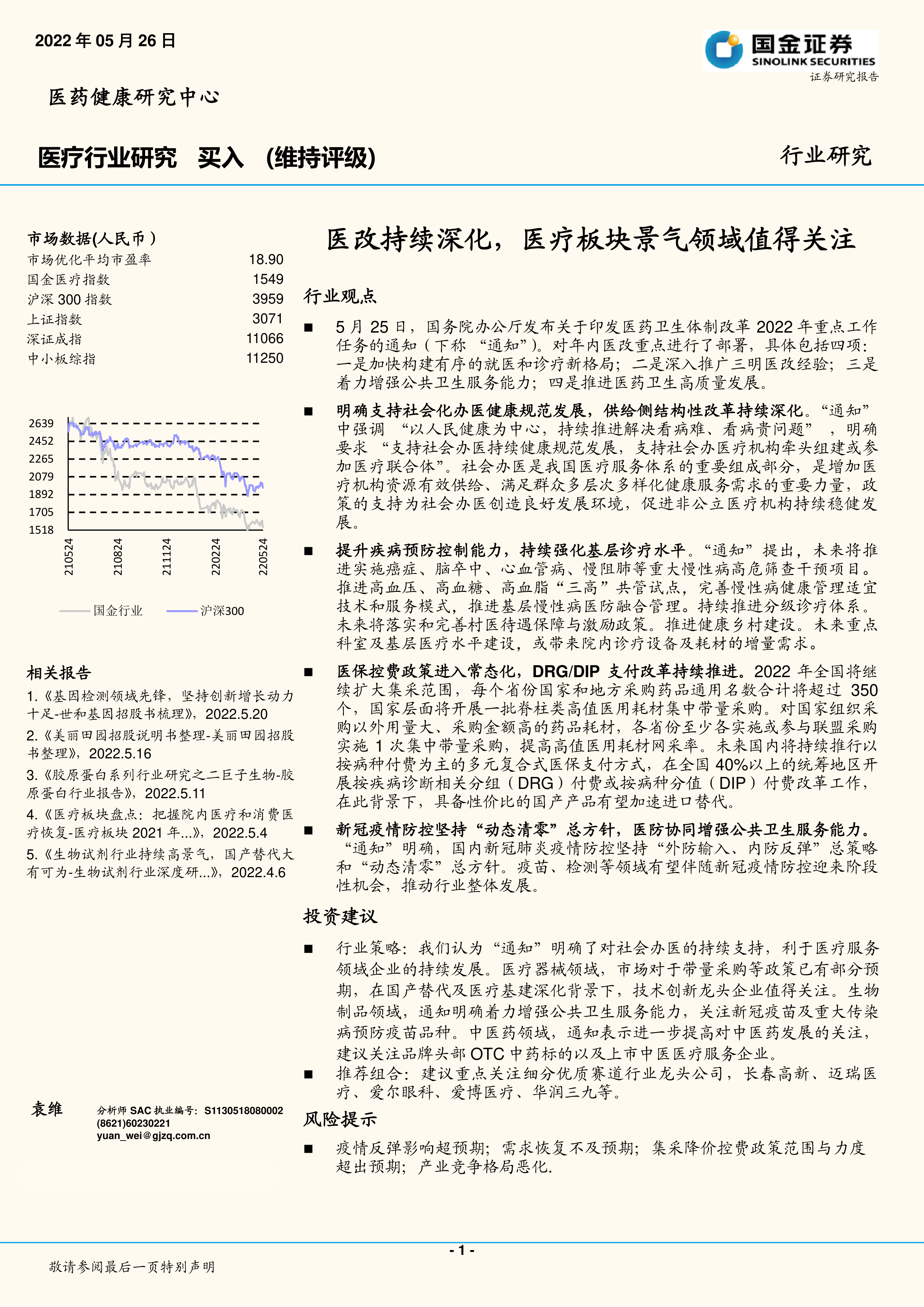报告首先解读了国务院办公厅发布的关于医药卫生体制改革2022年重点工作任务的通知,该通知涵盖了构建有序的就医和诊疗新格局、深入推广三明医改经验、增强公共卫生服务能力以及推进医药卫生高质量发展四个方面。报告结合市场数据(国金医疗指数、沪深300指数、上证指数、深证成指、中小板综指等),分析了当前医疗行业的市场环境和发展趋势。