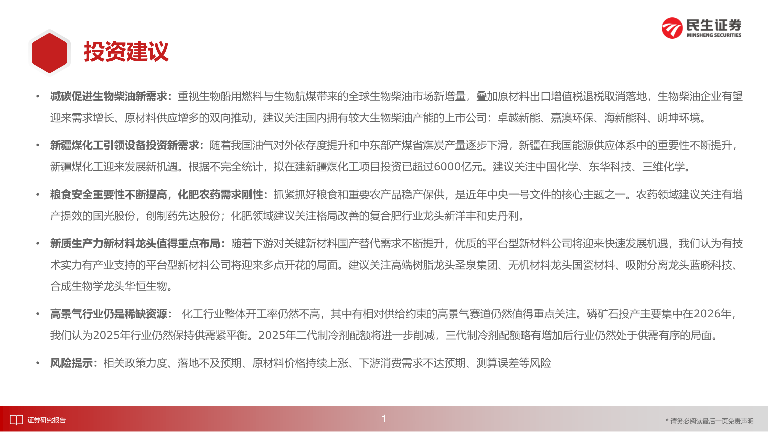 本报告基于民生证券的研究报告,利用统计数据和市场分析,对2025年化工行业的投资策略进行了深入探讨。报告认为,抓住“新需求”是化工行业投资的关键,并重点分析了生物柴油、新疆煤化工、农资、新材料以及磷矿石和制冷剂等高景气行业,并推荐了相关上市公司。 然而,报告也指出了相关政策风险、原材料价格波动、下游需求变化以及数据测算误差等潜在风险,投资者需谨慎评估。