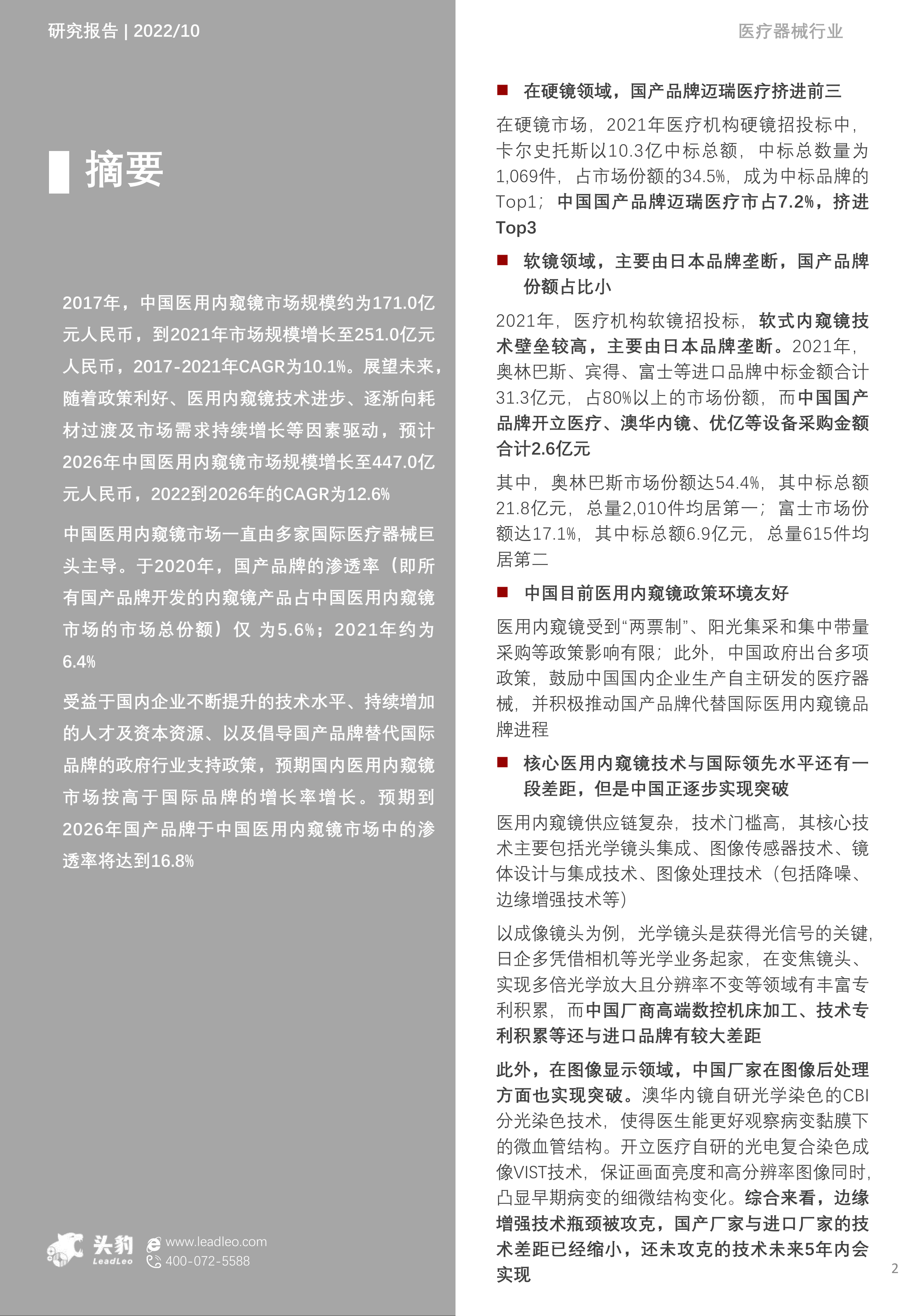 医用内窥镜受到“两票制”、阳光集采和集中带量采购等政策影响有限;此外,中国政府出台多项政策,鼓励中国国内企业生产自主研发的医疗器械,并积极推动国产品牌代替国际医用内窥镜品牌进程