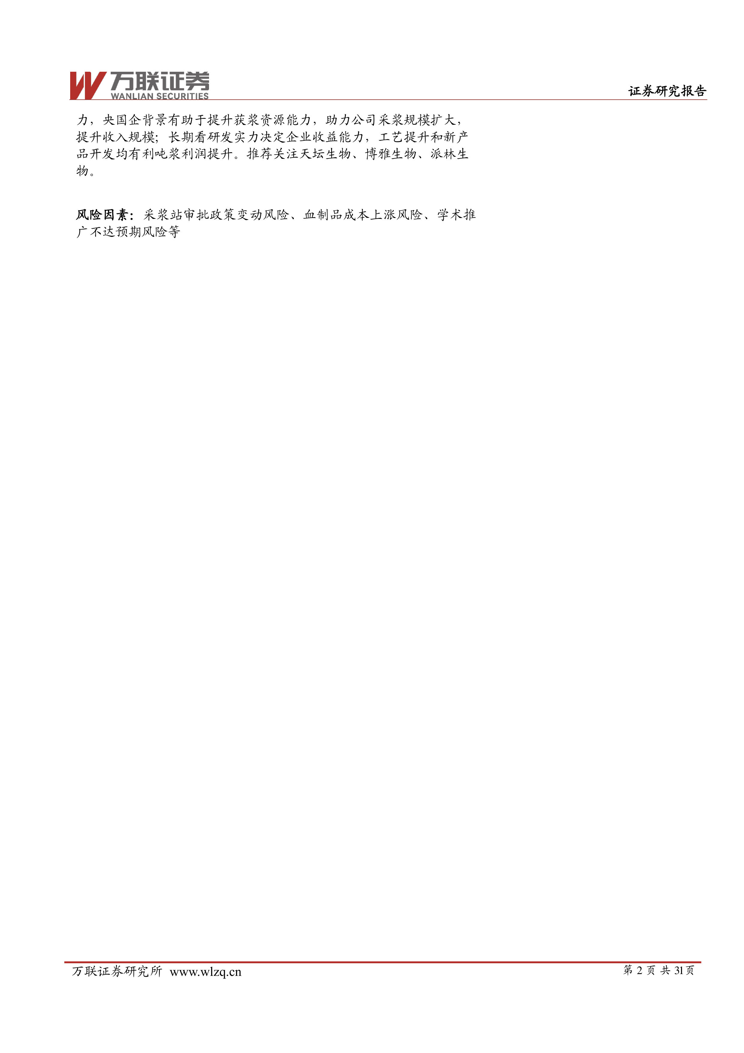 报告最后给出了投资建议,推荐关注天坛生物、博雅生物、派林生物三家公司,并对投资理由进行了详细阐述。 同时,报告也列出了投资风险,包括采浆站审批政策变动风险、血制品成本上涨风险、学术推广不达预期风险等。