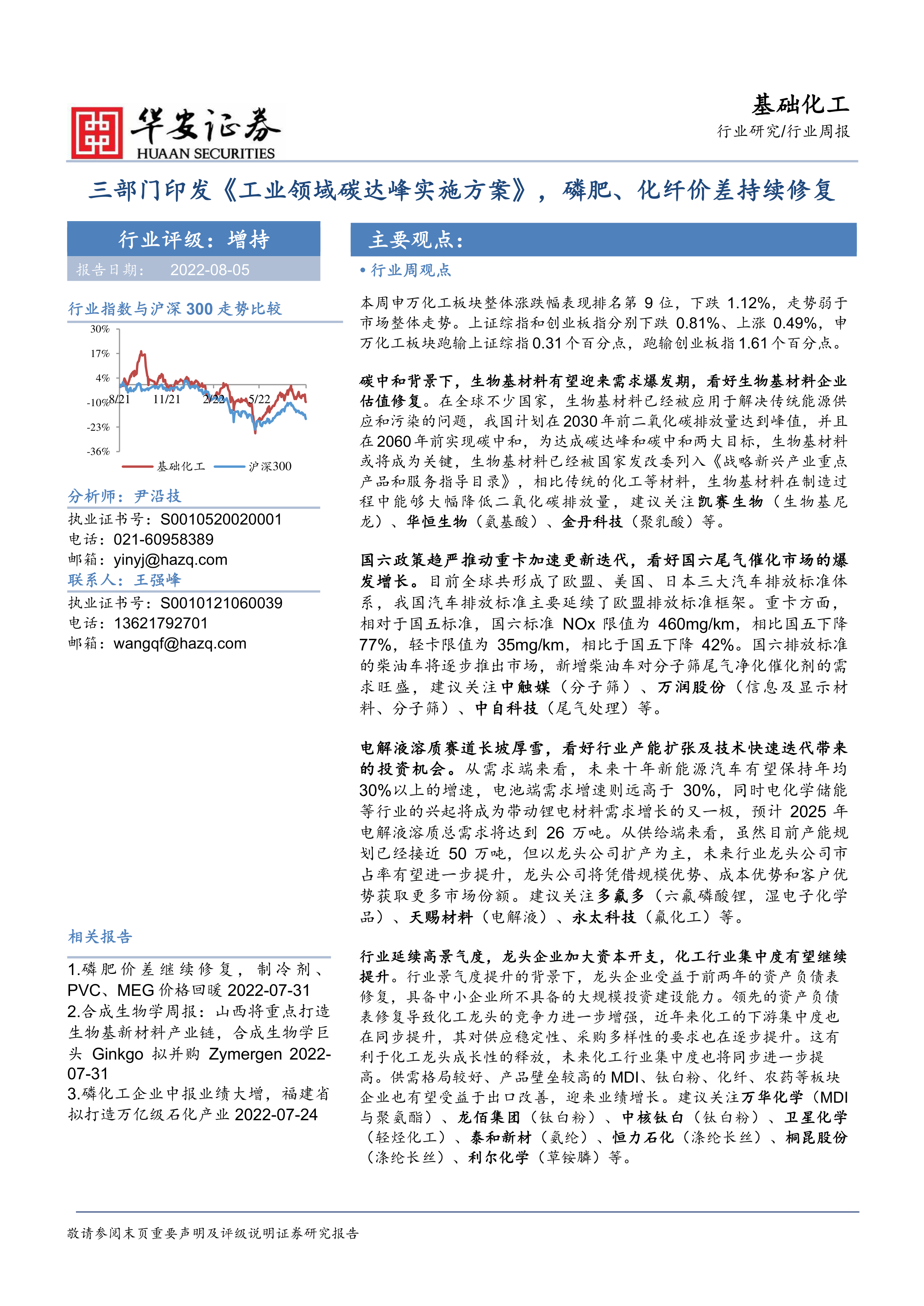 基础化工行业周报:三部门印发《工业领域碳达峰实施方案》,磷肥、化纤价差持续修复