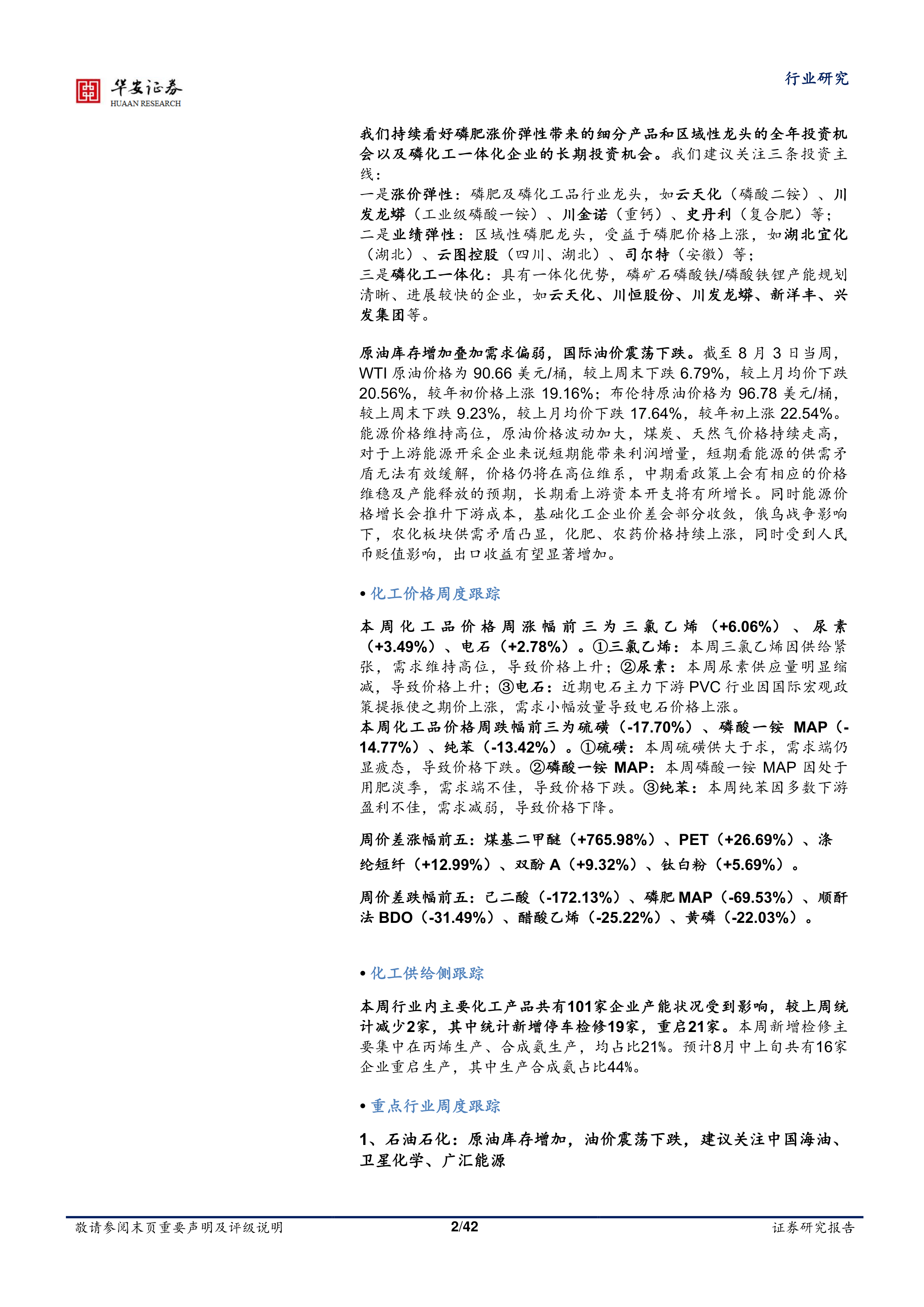 报告对石油石化、磷肥及磷化工、聚氨酯、煤化工、化纤、农药、氯碱、橡塑、有机硅、钛白粉等十个重点行业进行了周度跟踪,分别分析了各行业的供需状况、价格波动、产能变化以及重点企业动态。